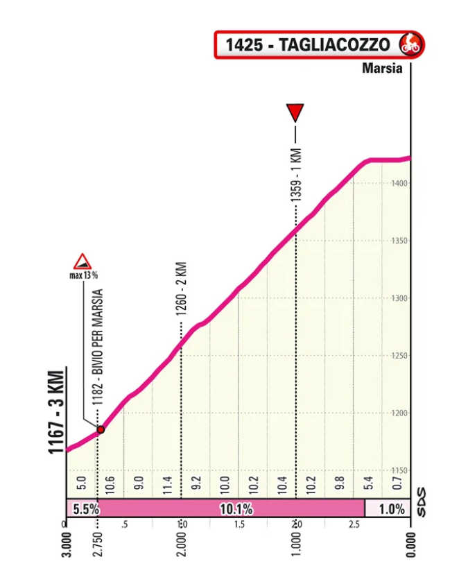 この日最後の登りはジロ・デ・イタリア初登場らしい。距離11.9kmで平均斜度は5.5%。数値的にはそれほど特別なものではない。そして最後の山頂手前の部分のデータはこのようになっている。