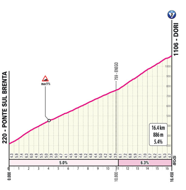 今日の中盤に登場する1級山岳モンテ・グラッパのプロフィールがこちら。