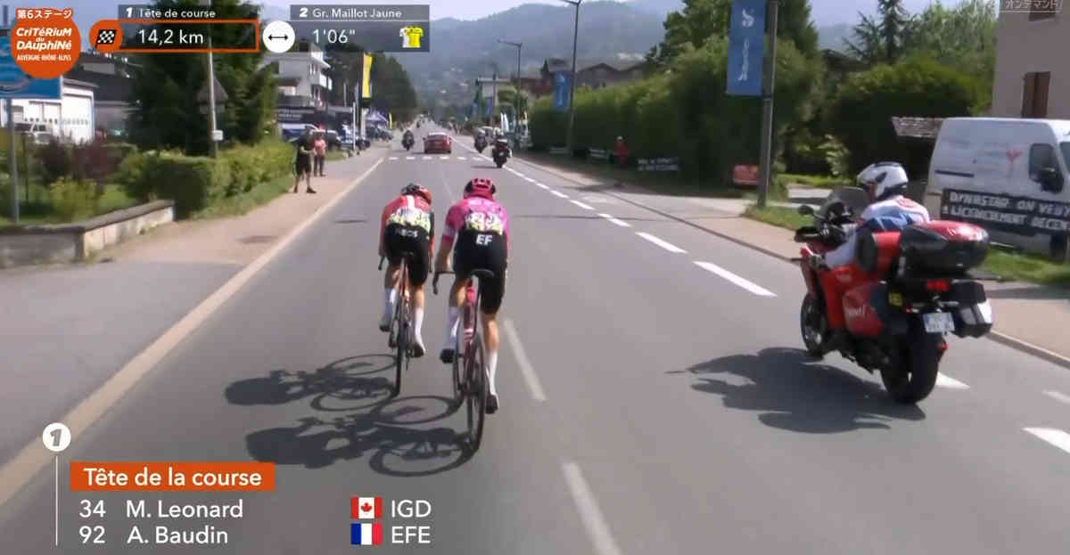山頂フィニッシュの舞台となるのは2級山岳の連続。その最初の2級ドマンシーの登りに入ると逃げの2名(EF Education-EasyPostのアレックス・ボーダンとINEOS Grenadiersのマイケル・レオナード)と、プロトンとの差は1分ほどに。