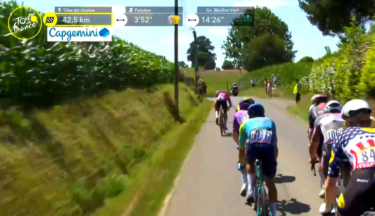 上の画像からでもわかるように残り30km弱でプロトンとの差は5分以上となっており、この日のプロトンは完全にサイクリングとなることが確定。