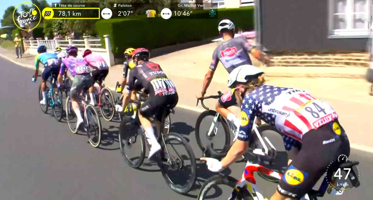 その逃げのメンバーには今日のステージの優勝候補として有力なベン・ヒーリーやクイン・シモンズなど。しかし同時に個人的には意外な選手が含まれていた。その逃げ集団のメンツはこの8名。