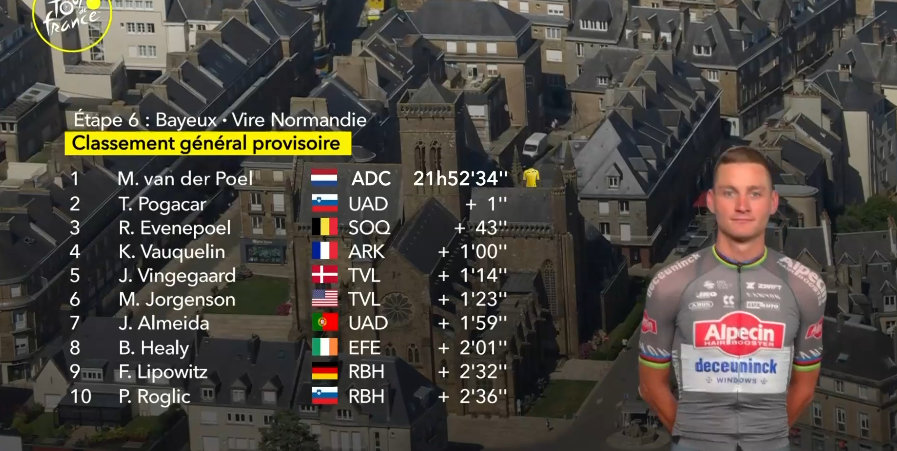 一方でこの大逃げに乗ったマチュー・ファン・デル・プールはプロトンとのタイム差次第で、タデイ・ポガチャルからマイヨ・ジョーヌを奪える可能性が高くなっていた。第5ステージ終了時点でその差は1分28秒。