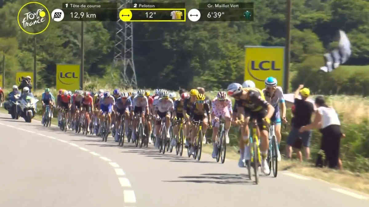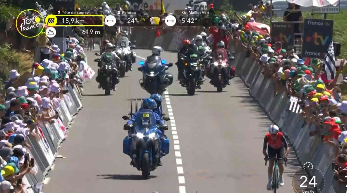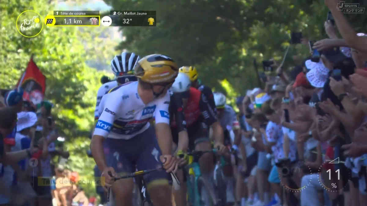 1回目の登りはそのコステューが独走のまま頂上をクリア。しかし優勝候補たちの集団は24秒差に迫る。