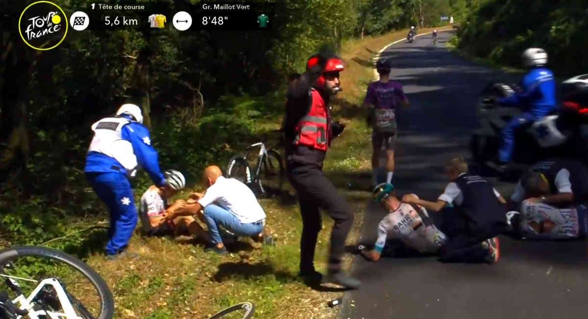 道路脇でころんだアルメイダ、道路上のサンティアゴ・ブイトラゴとジャック・ヘイグたちがなかなかレース復帰できない。ここでアルメイダを失うとUAEはポガチャルの山岳アシストが減って大ダメージ(理論上では)となるところだったが、なんとかアルメイダはレースに復帰している。ただ負傷の状態が心配だ。