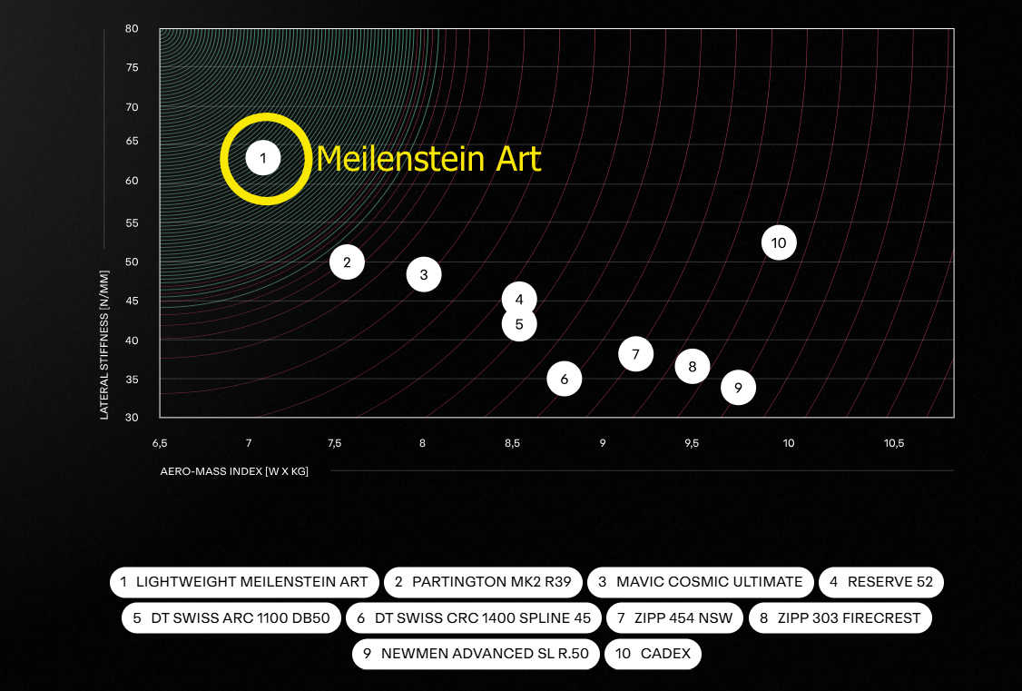縦軸は横方向の剛性、横軸はエアロ性能指数となっている。エアロ性能指数が低いほど良好と思ってほしい。このグラフからMeilenstein Artの両性能のバランスは突出している。もちろん実際の性能はどうか走らせてみないとわからないが。