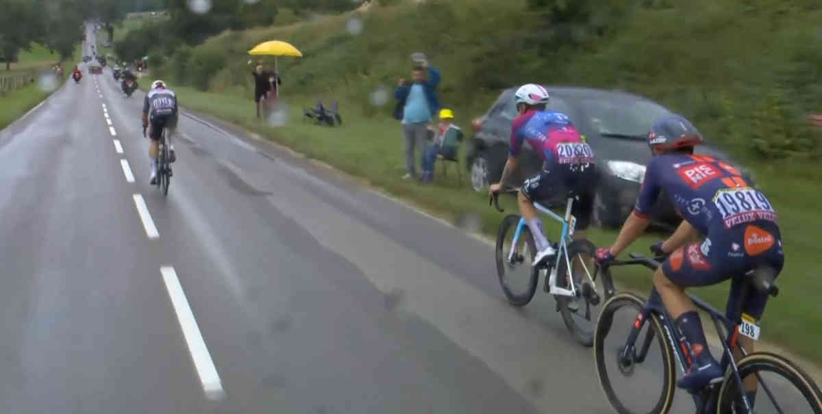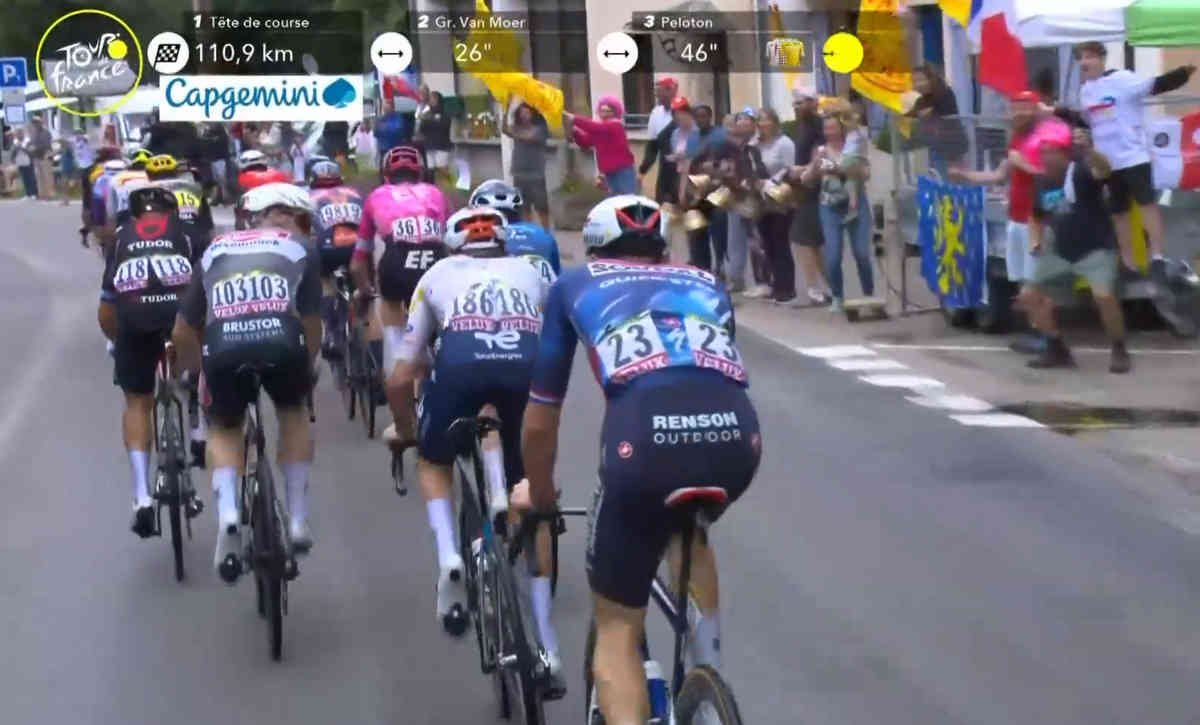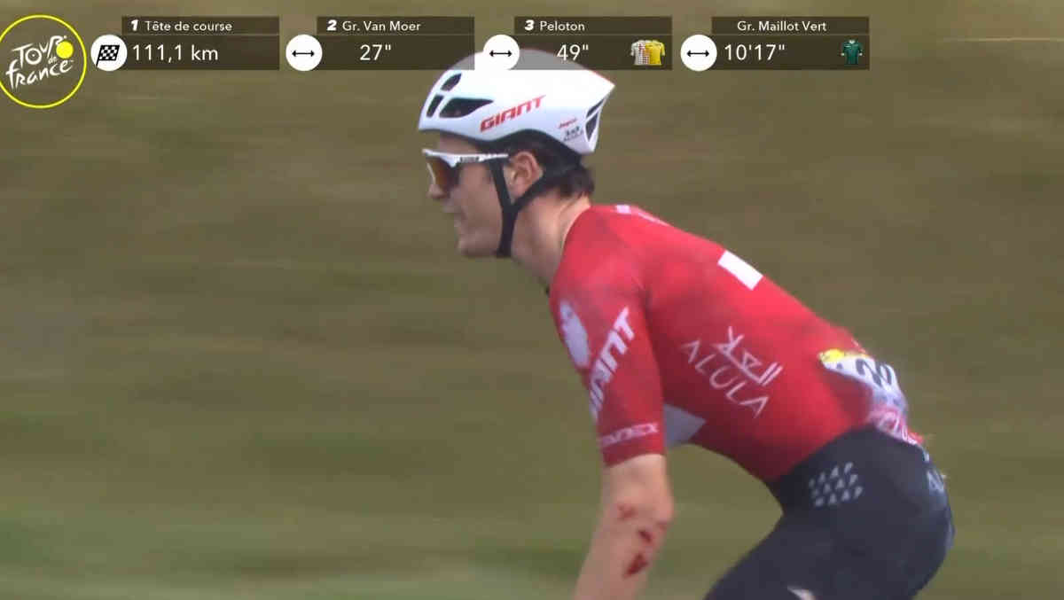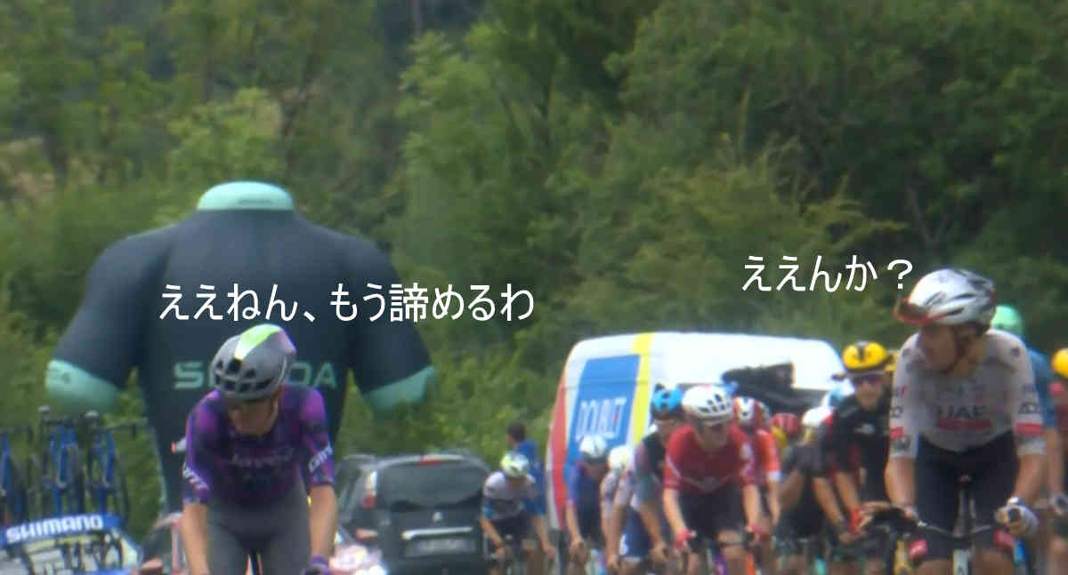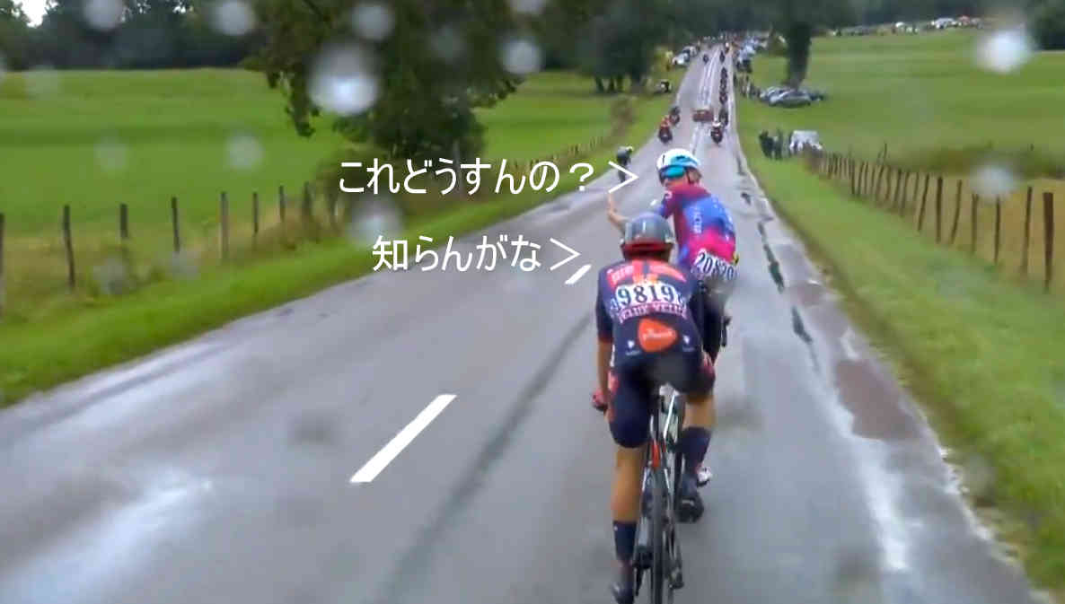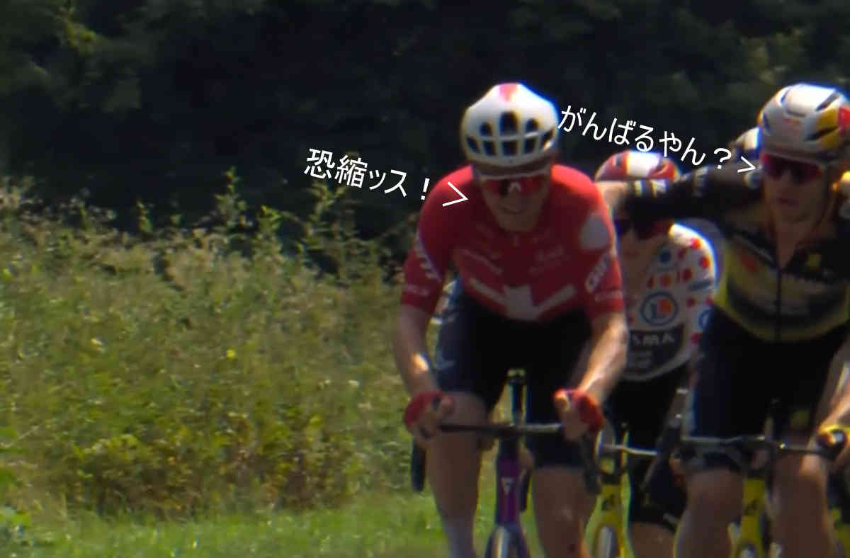 ジュガットはこのようにオスカル・オンレーベン・オコナーのいるプロトンから5分以上の差をつけ続ける。一方でオコナーはプロトンでこの表情。