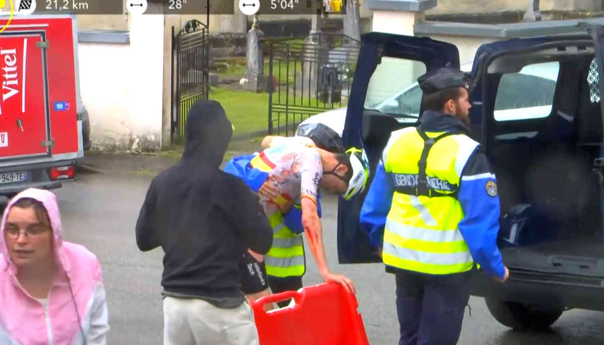 残り21kmのカーブを先頭で入ったイヴァン・ロメオが雨に濡れた路面で落車。しかも路面を滑り落車の勢いのまま歩道との段差に衝突。ジャージもボロボロになり、擦過傷も多数。下手すれば小さな骨折もあり得るかもしれない。