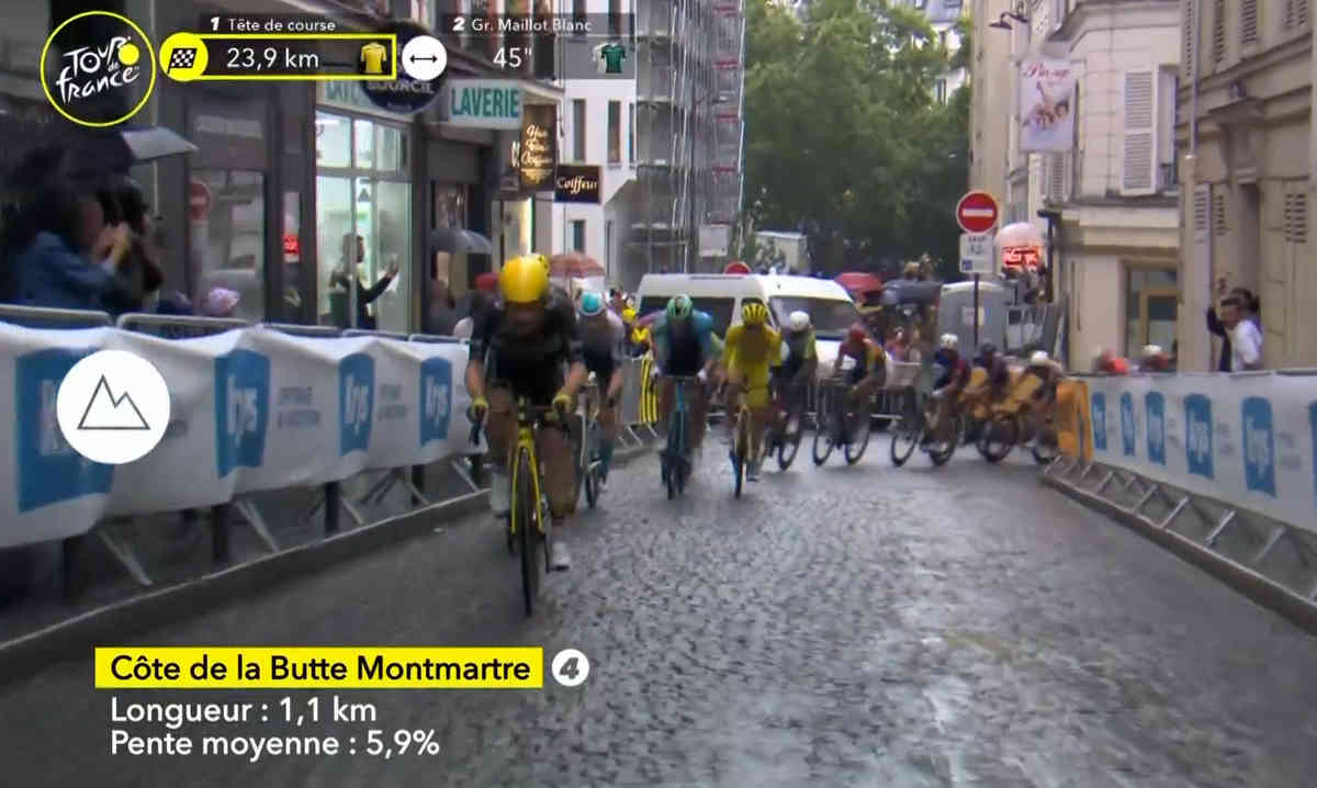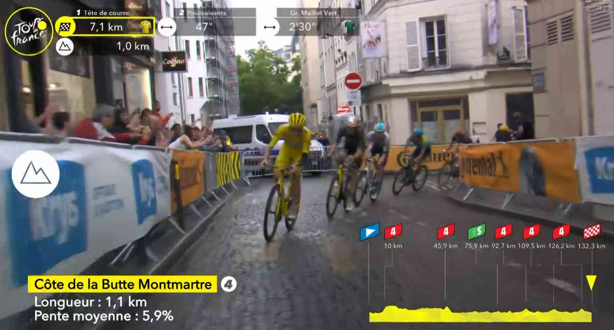 最後のモンマルトルにはポガチャル先頭で突入。ここからポガチャルがガンガン踏んでいく、やはり本気でステージ優勝を狙うつもりだ。