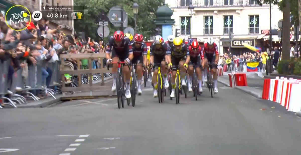 パリのシャンゼリゼに到着したプロトンはいよいよ本日のステージ優勝争いが本格化。モンマルトルの丘を3回登るわけだが、まずはその1回目に向けて、残り40数キロからプロトンが高速化。