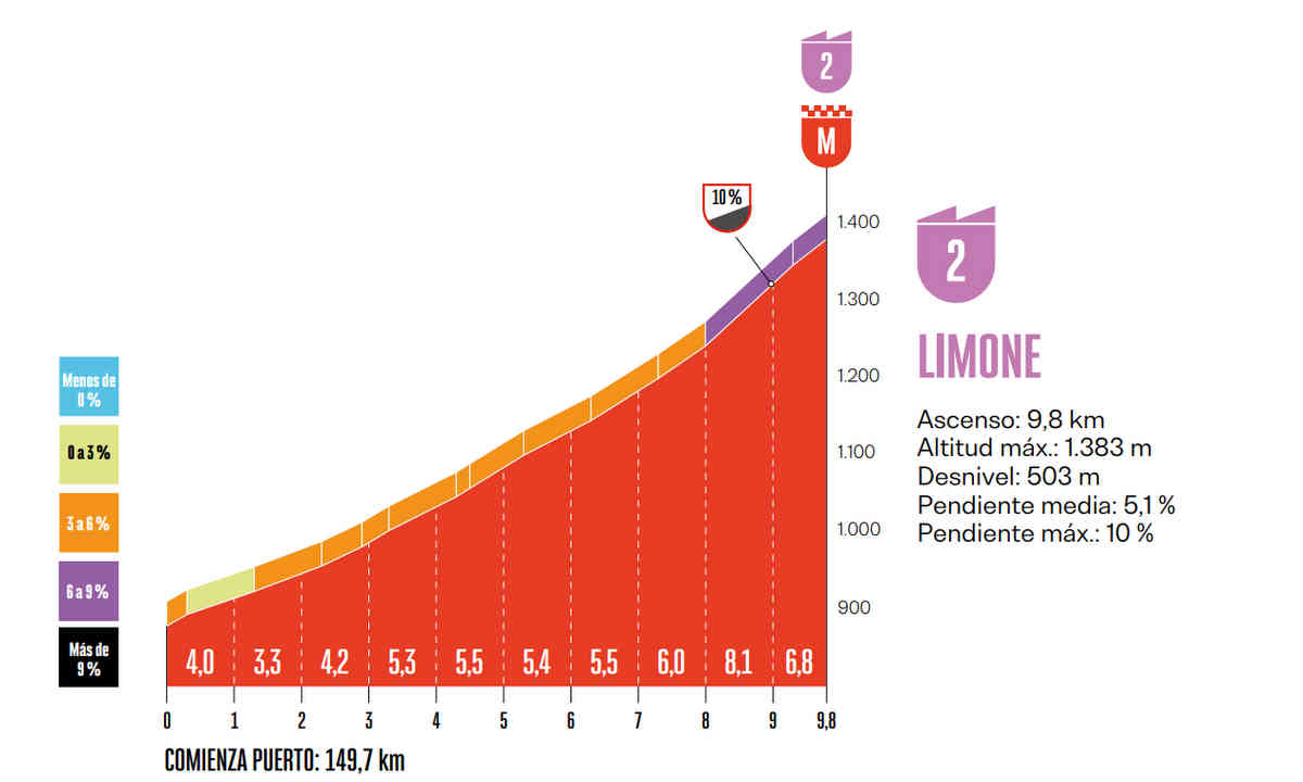 さて最後のフィニッシュの舞台は2級山岳で、距離9.8km、平均斜度5.1%とさほど特別な特徴の登りではない。最大斜度は10%だ。その2級山岳Limoneのプロフィールがこちら。