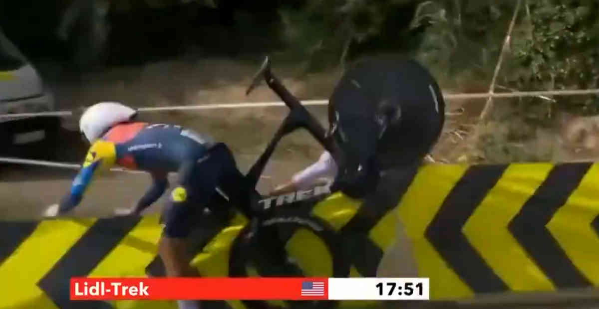 Lidl-Trekは第2計測を暫定首位で通過した直後にカルロス・ベローナがこのように落車するも、そのままの勢いを保ち暫定首位でゴール。