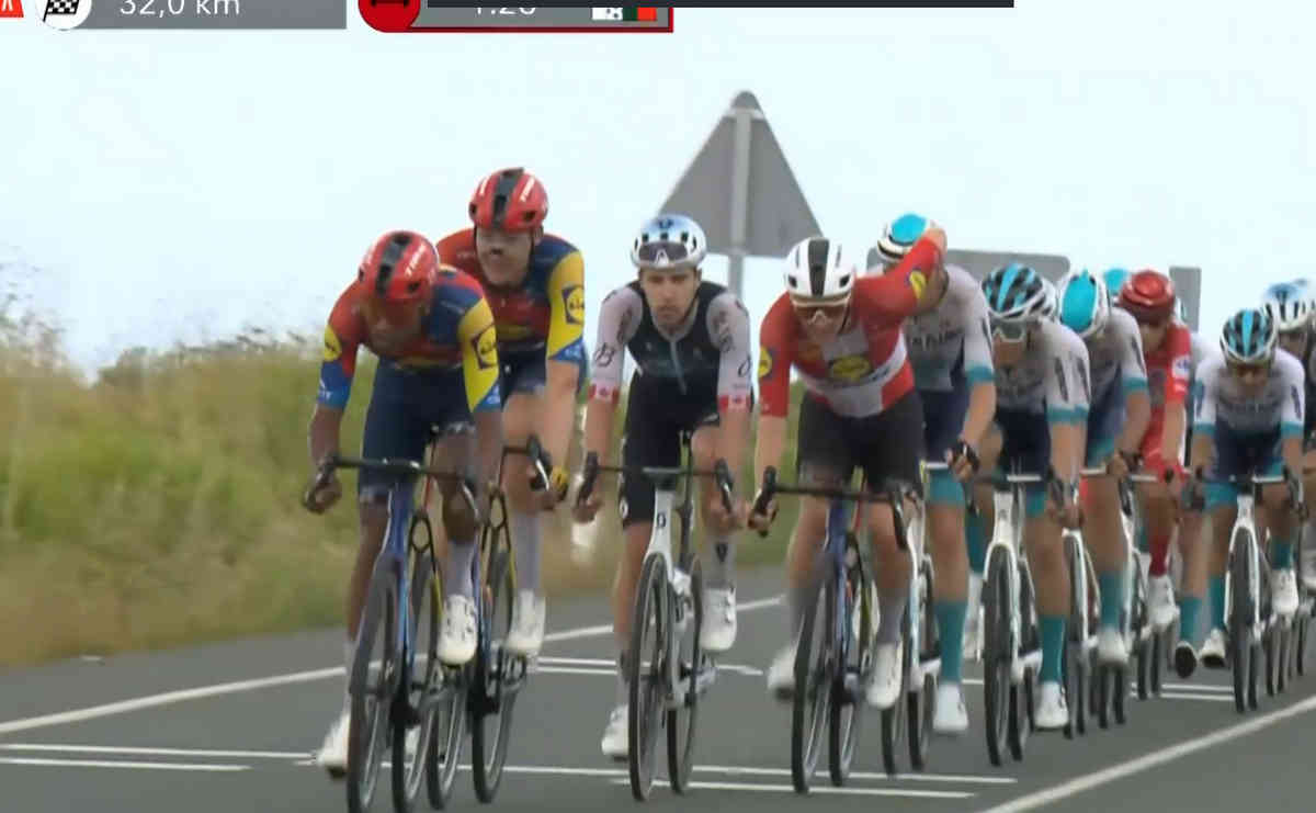 この日はスタート直後から逃げアタックが頻発もなかなか決まらなかった。しかし20km走ったところで5名の逃げがプロトンから1分30秒以上を稼ぐだすことに成功し、これが決定的な今日の逃げとなった。その5名は次のようなメンバーとなる。