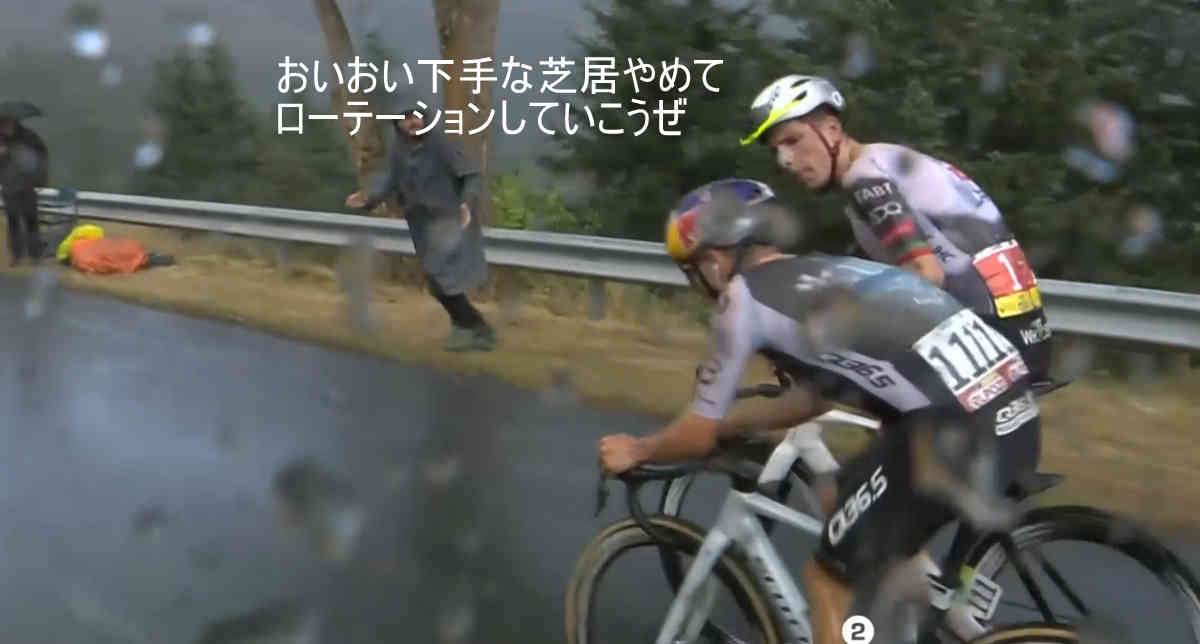 今日のTeam Visma | Lease a Bikeのミーティング内容はどうだったのだろう。調子よければステージ優勝狙うのが基本で、「マイヨ・ロホ獲得してしまってもしゃーない」ぐらいの感じだったのだろうか。ひょっとしたらトレーエンとの差は1分以内にしとくというのが最優先目標だったのかもしれない。今後どのようなトラブルが起こるかわからないので、大きなタイム差が開いたままなのを嫌ったのかも。