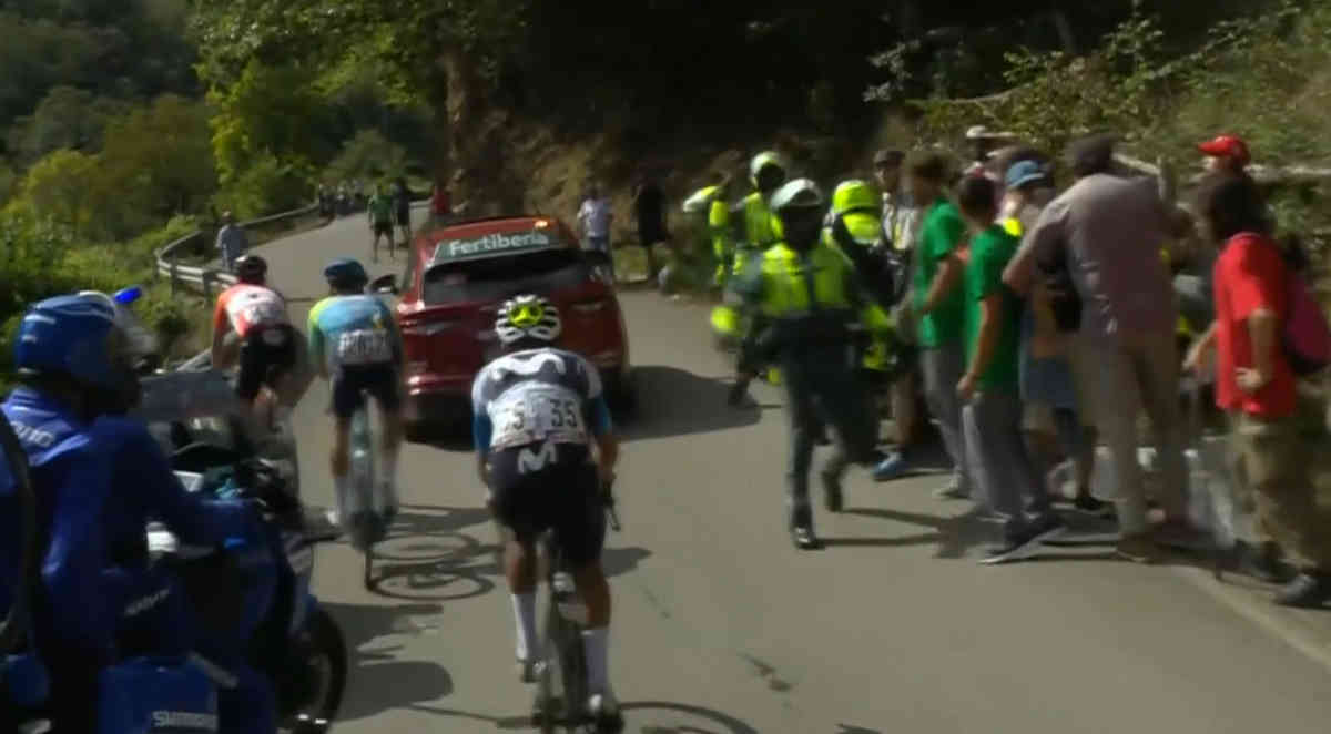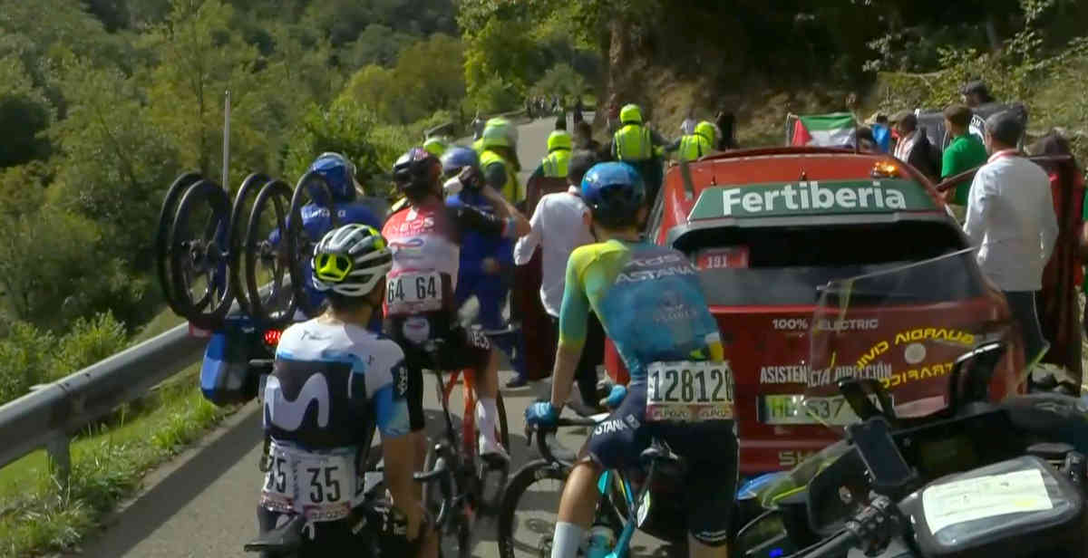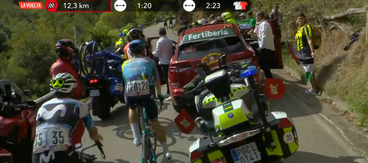 逃げの3人、ボブ・ユンゲルス、ニコラス・ヴィノクロフ、ジェフェルソン・セペダがアングリルに入ったすぐのところで、横断幕を掲げた数人が道路へ。逃げの進行が完全にストップされてしまう。