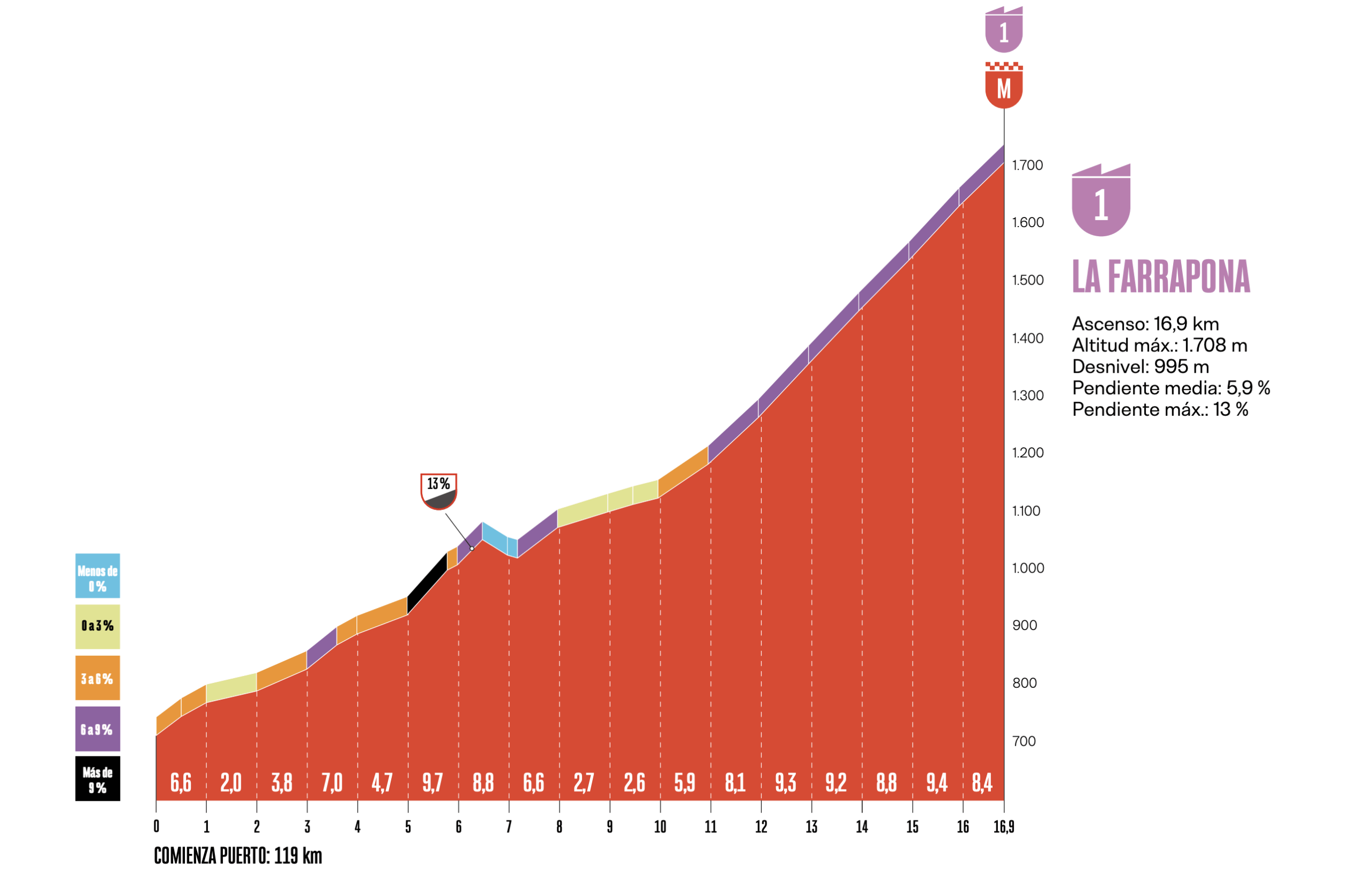 距離10.1km、平均斜度8.5%、最大斜度14%。序盤よりも特に終盤にかけてつらくなるレイアウトで、終盤は最大斜度区間のオンパレードである。