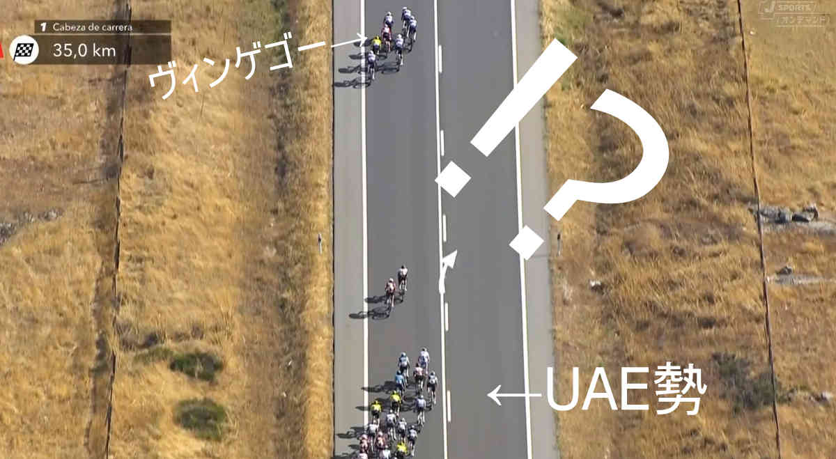 この奇襲にはプロトンも大急ぎで対応。特にUAE勢が先頭でヴィンゲゴーたちに追いつくことに成功。また同時にこのペースアップにより逃げていたBurgos-BHの2名も吸収されてしまう。