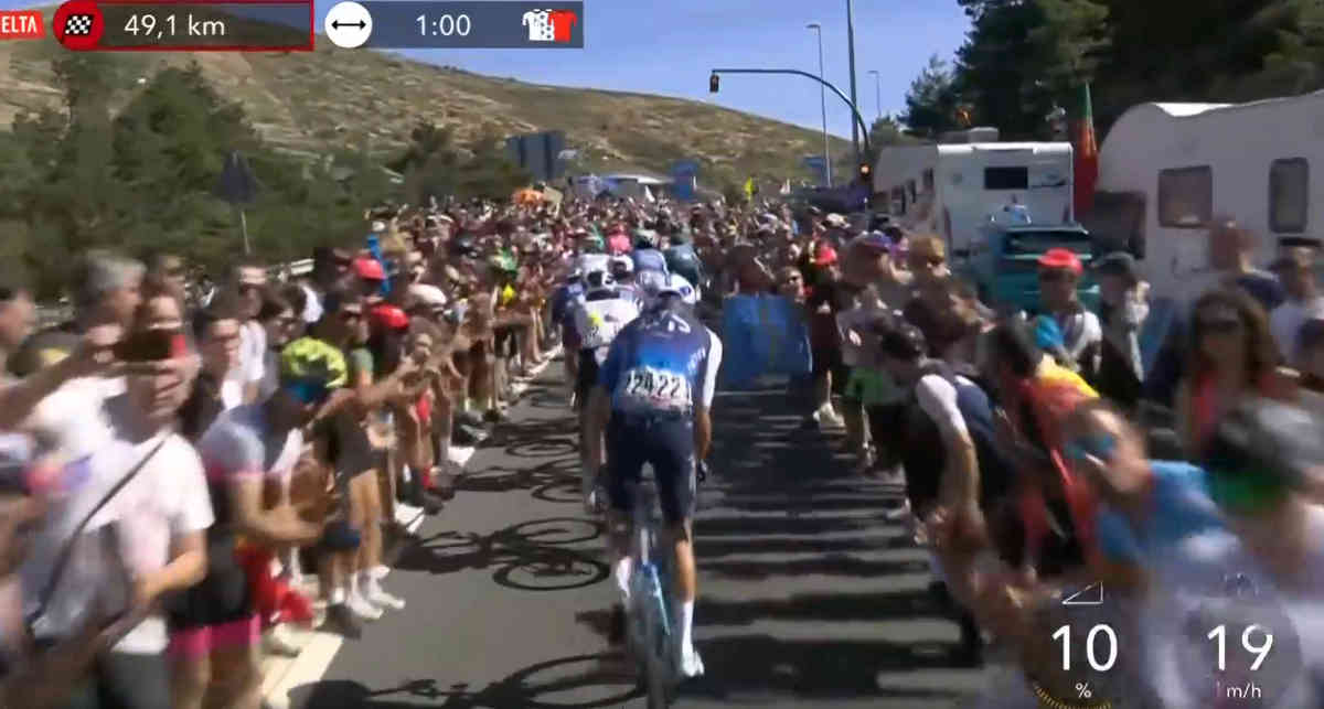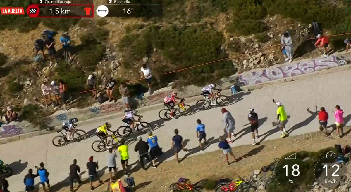 ジョアン・アルメイダが先頭で登っていくが、途中でジャイ・ヒンドレーが先頭にたちペースアップ。20%が断続的に登場する凶悪な区間で、しかもアスファルト舗装されていない路面。ところどころグラベルのような状況もあるまさに地獄の酷道だ。