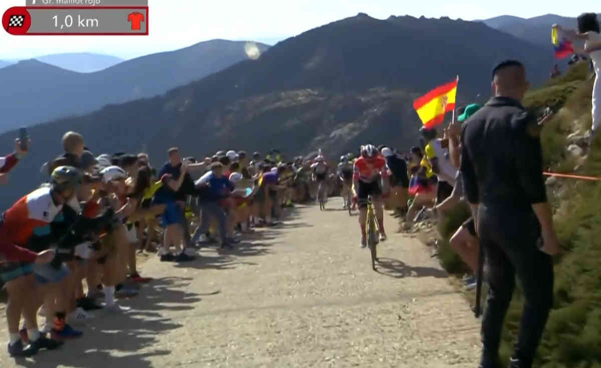 残り50kmで登場する1級山岳のPuerto de Navecerradaは逃げ集団がプロトンから1分差で通過。プロトンはやはりUAEがずっと先頭でコントロール。上述のように最後の超級山岳でアルメイダでステージ優勝を狙うためにペースを刻み続ける。