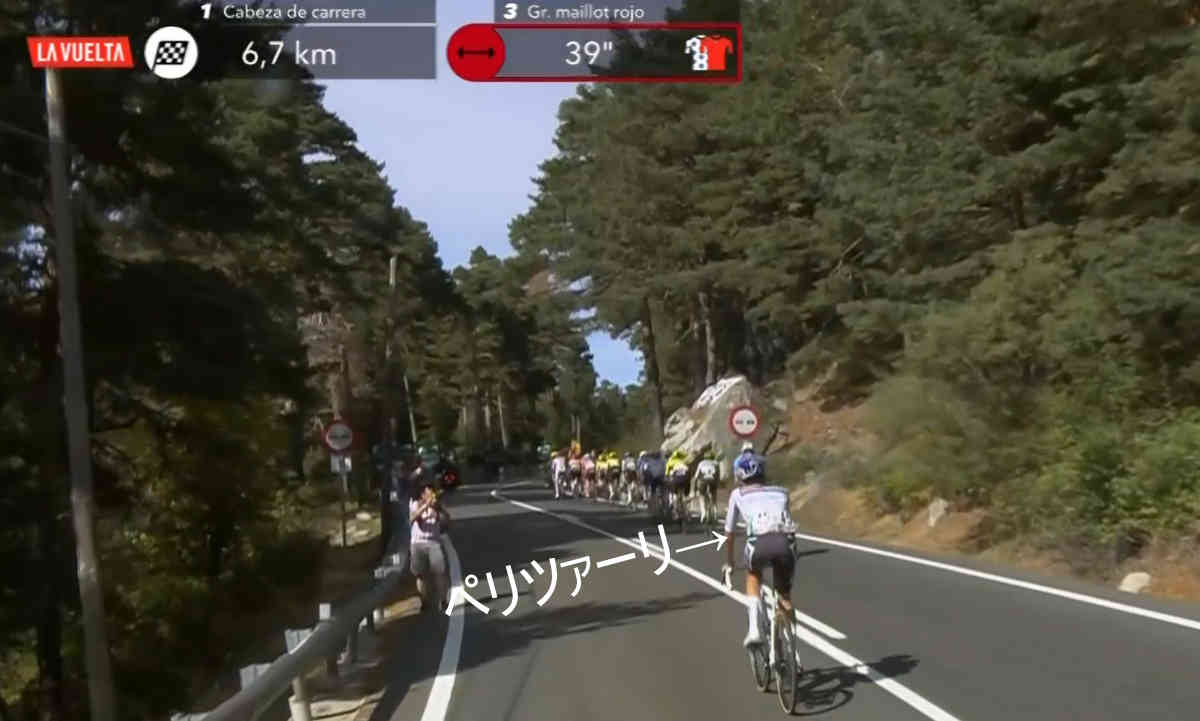 その中には、なんと新人賞1位のジュリオ・ペリツァーリが。これは非常にまずい。新人賞2位のマシュー・リッチテッロがメイン集団に残っているからだ。しかもペリツァーリはどんどん離れていき、なんと1分近くの差がついてしまう。最後の最後で新人賞を失うのか!?