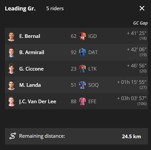 その逃げには、山岳賞3位のルイス・フェルヴァーケをはじめ、ブイトラゴ、ベルナル、ランダ、チッコーネなどなど予想通りのつよつよメンバーが揃う。