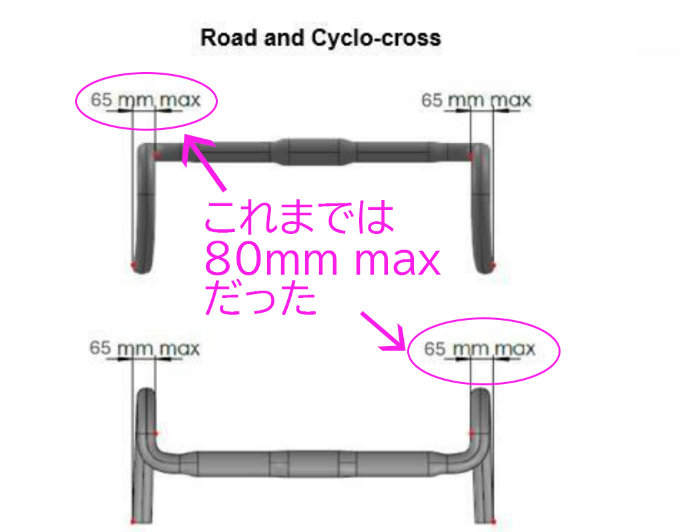 ハンドル幅は最少400mm、そして上画像のようにブラケット部分から下ハン部分までの外幅・内幅の差は最大で80mmだったのが65mmにまで制限される。