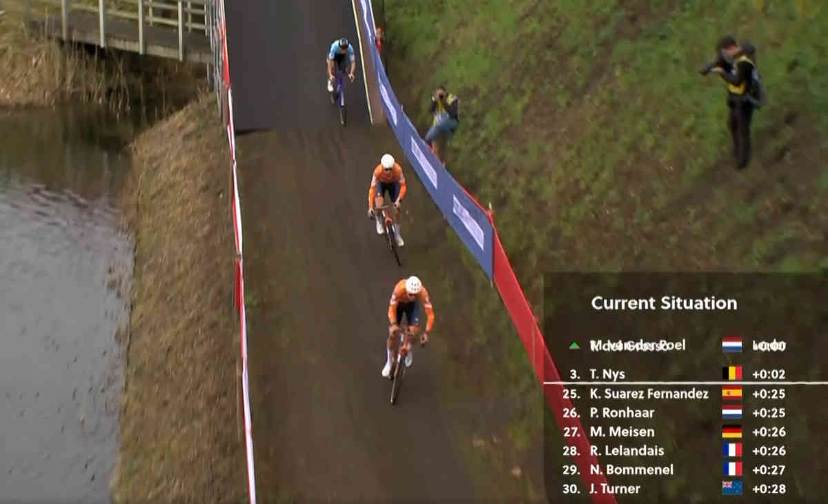 スタート直後のコーナーをいくつかこなすと、オランダ代表としてエリート男子デビューとなった22歳ティボール・デル・フロッソを先頭に、2番手にマチュー・ファン・デル・プール、そして3番手に23歳のティボー・ネイスという構図に。この3人が第1周回の序盤からレースを支配する。