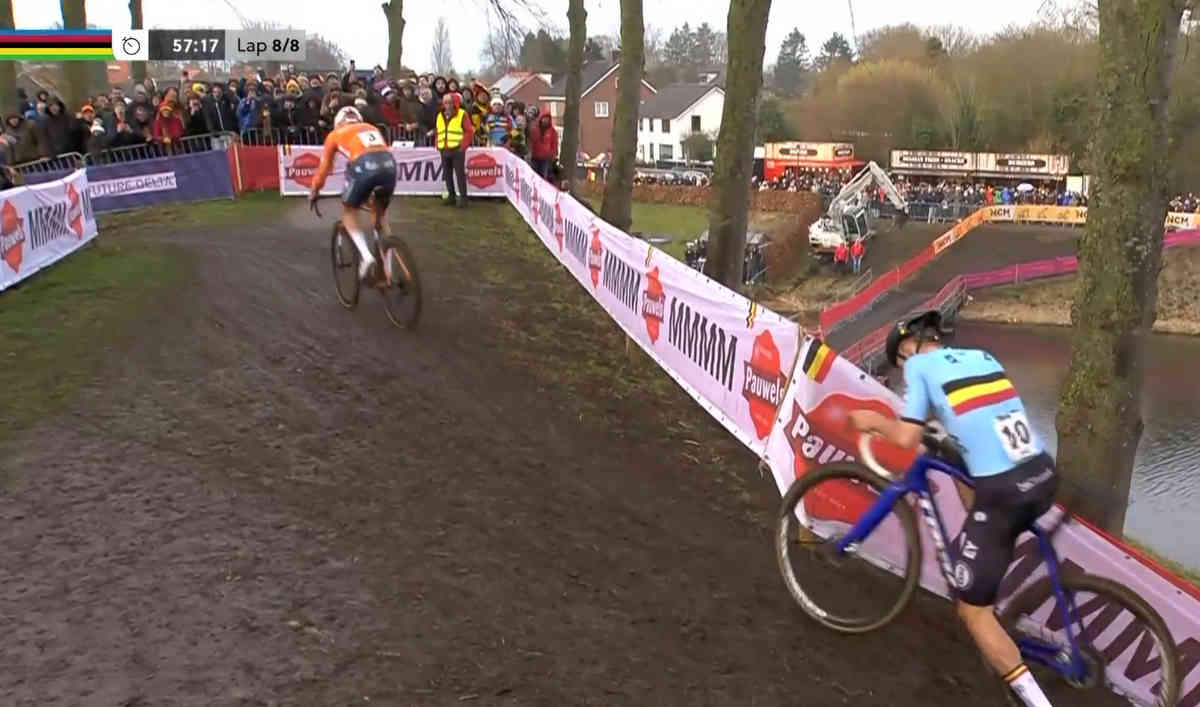 さてこの世界選でのマチュー・ファン・デル・プールだが、最大のライバルのワウト・ファン・アールトが参戦しなかったこともあり、とにかくリスクをいかに減らして賢く走るかに集中していたように見える。上で述べたように、バニーホップを封印したことがその象徴ではないだろうか。