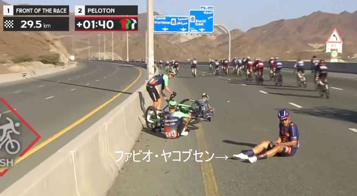 プロトンでは残り30kmあたりで落車。これにこの日の優勝候補の1人だったTeam Picnic PostNLのスプリンター、ファビオ・ヤコブセンが巻き込まれる。