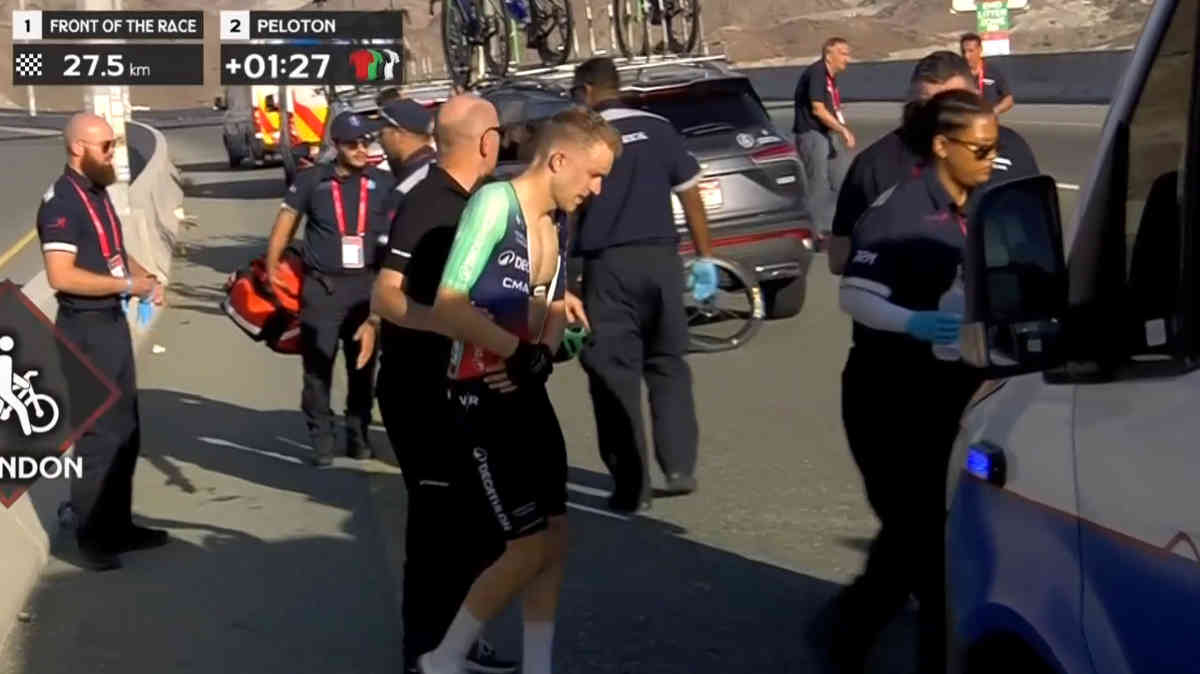 一方でDecathlon-CMA CGMの選手で最後まで立ち上がれなかったロベ・ヘイスはこのようにリタイア。