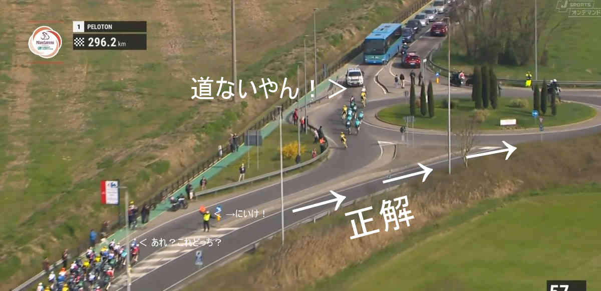 すぐ後方のプロトンもこのように間違えたほうへ進みそうになり少し混乱でスピードダウン。