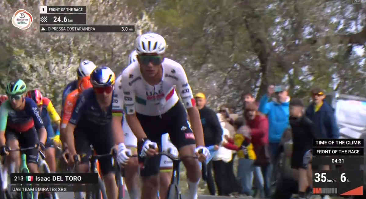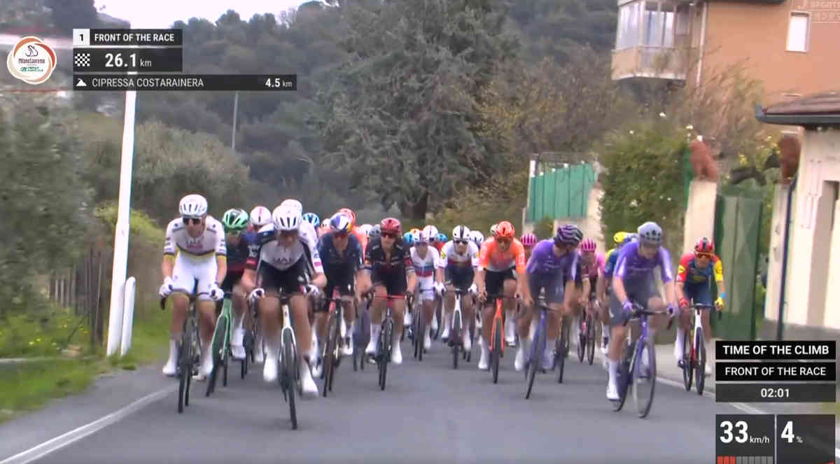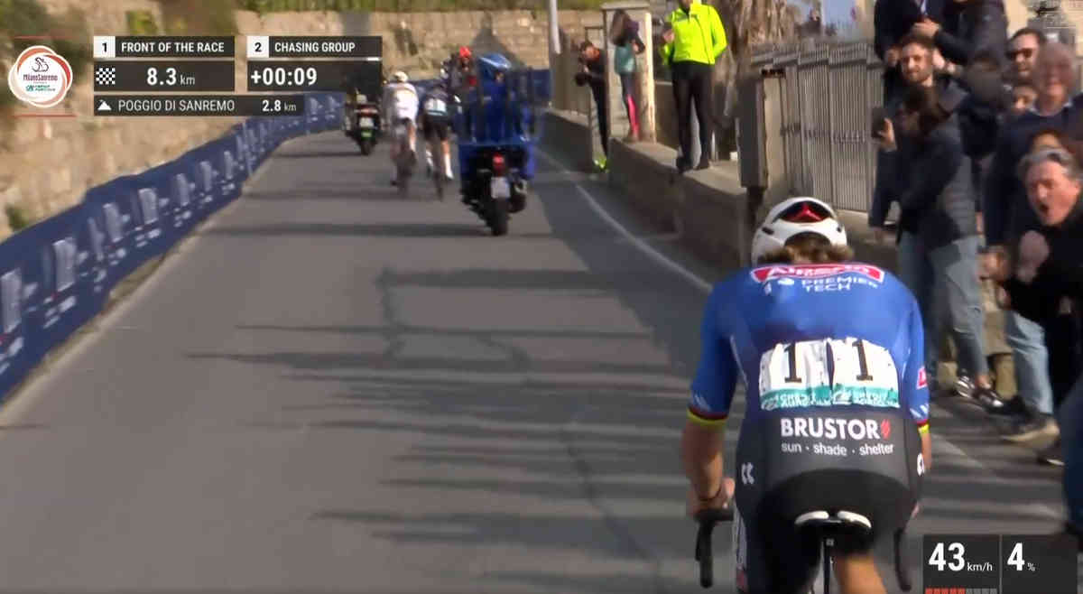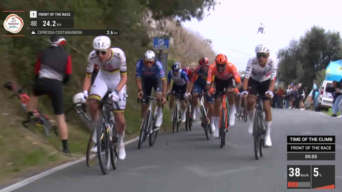 The ego of the World Champ, down a few kilometers ago, and he goes thermonuclear in La Cipressa! Only Tom Pidcock, and his best frenemy, Mathieu van der Poel, can follow!