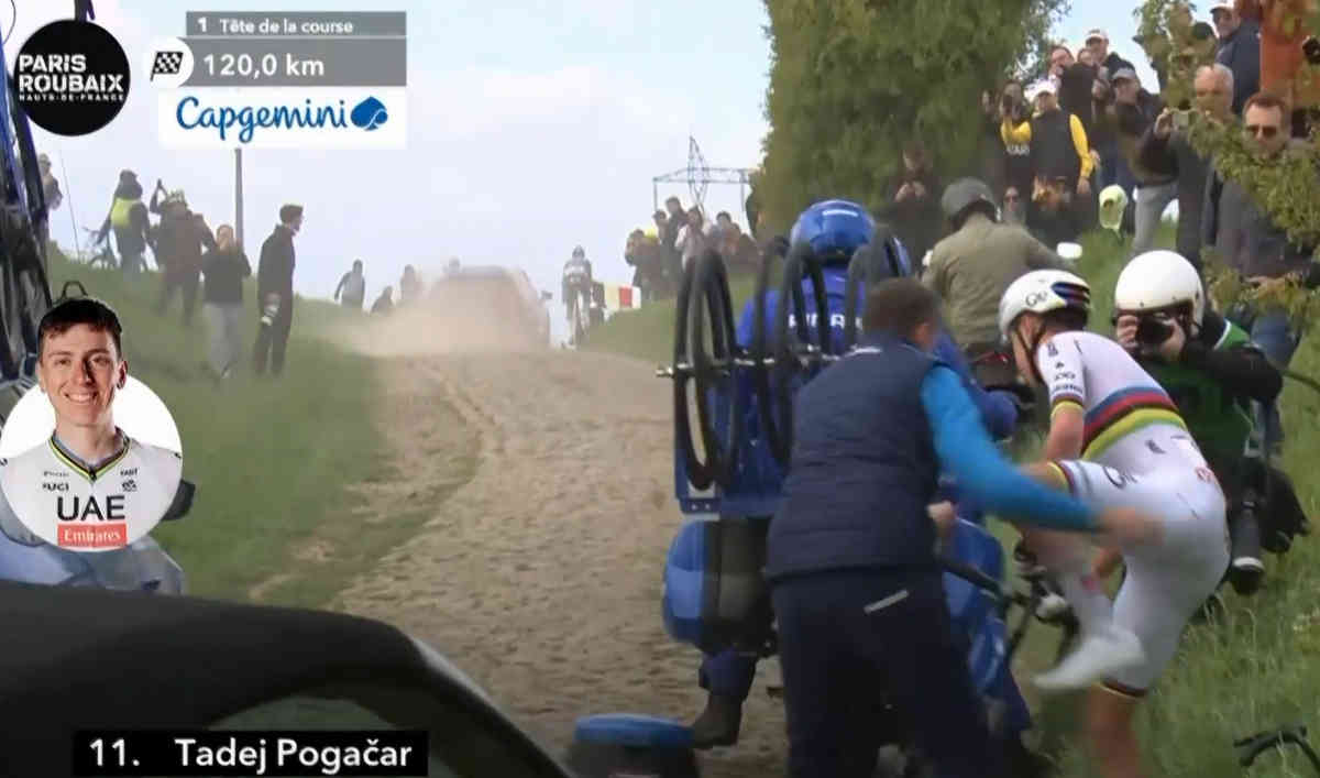 アランベールまで残り25kmとなった石畳区間でタデイ・ポガチャルがパンク!この区間は道幅は狭いためチームカーがなかなか来れない!