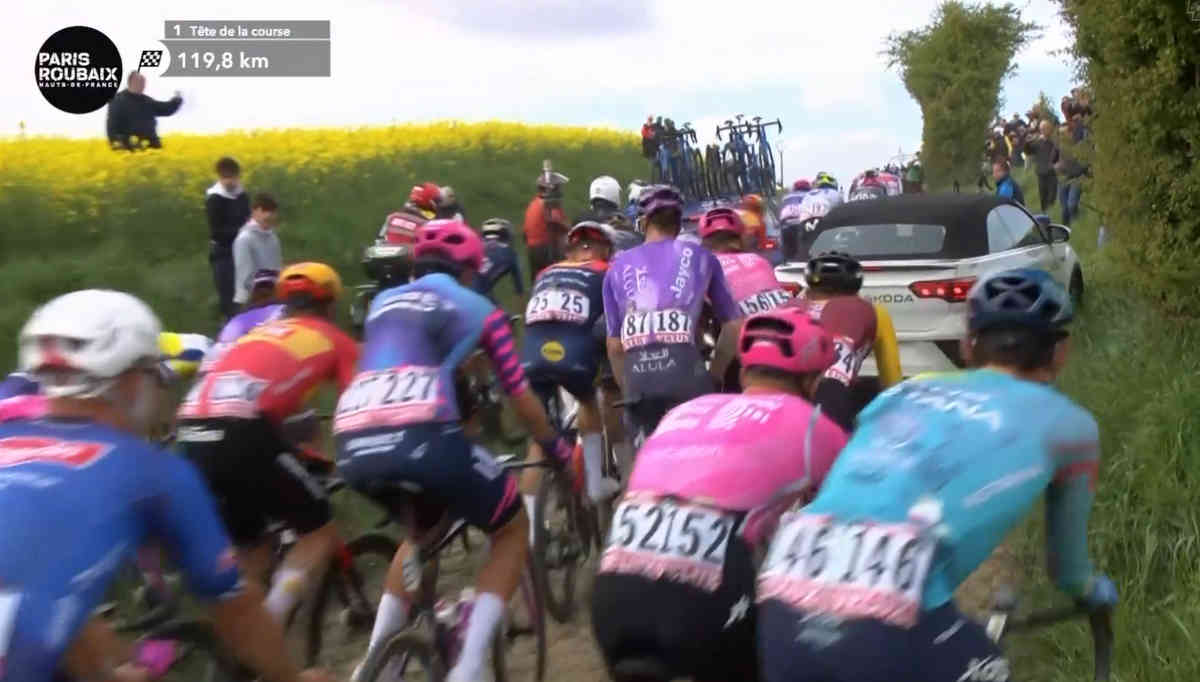 このあとマチューはチームカーからスペアバイクを受け取り、追走をスタート。