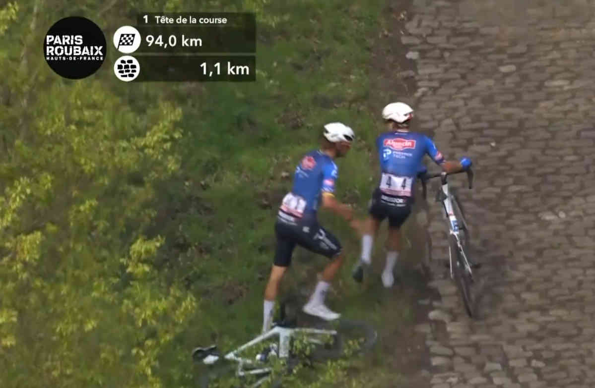 このあとポガチャルはシマノのニュートラルバイクから自身のスペアバイクに乗り換え、そしてマチューがいる先頭集団にアランベール/アーレンベルグを前に合流することに成功する。