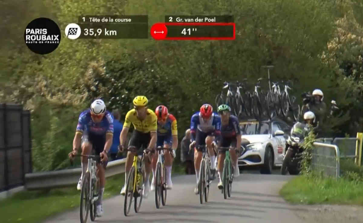 しかしマチューのチームメイトがフィリプセンとプランカールトぐらいしかいないように見え、しかも、ポガチャル集団との差が2分近くついてしまっており、マチューが絶体絶命の危機的状況となる。