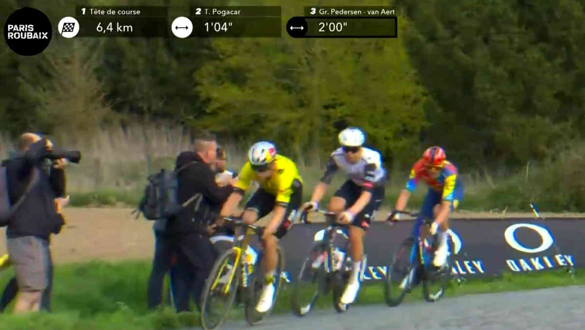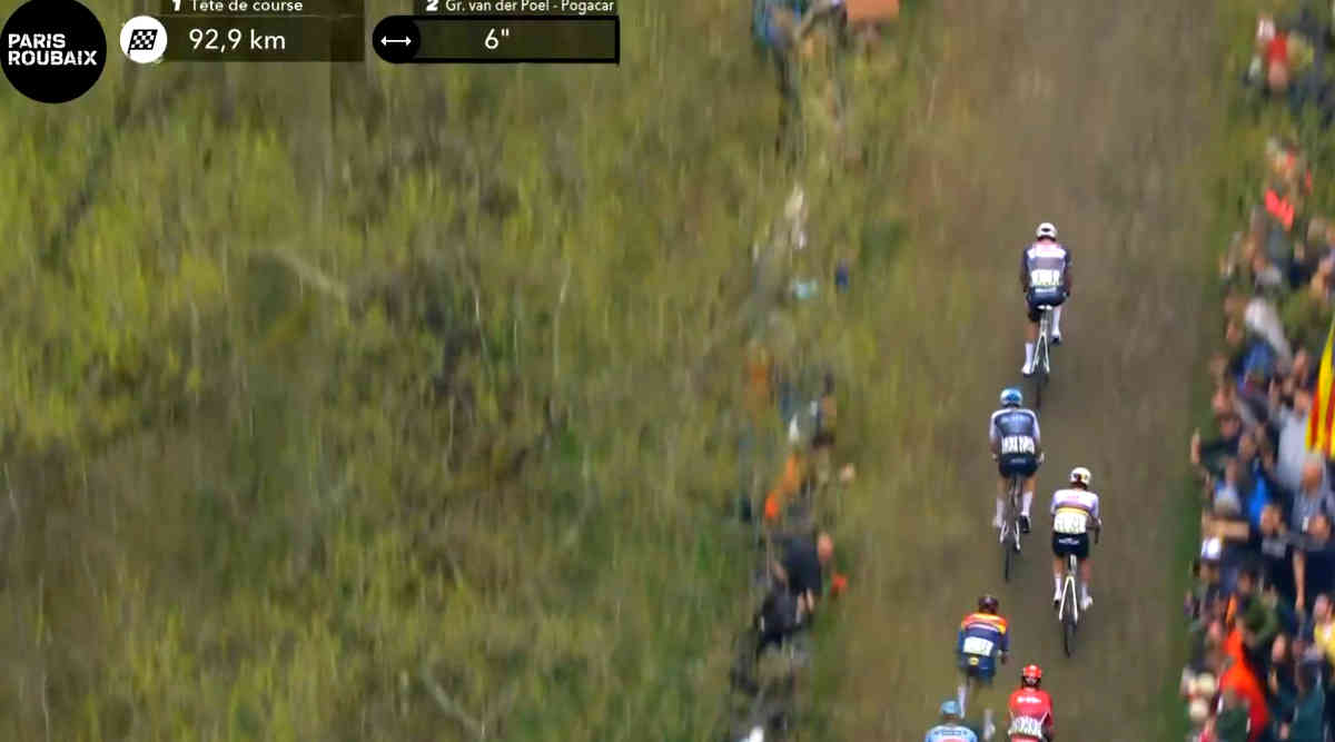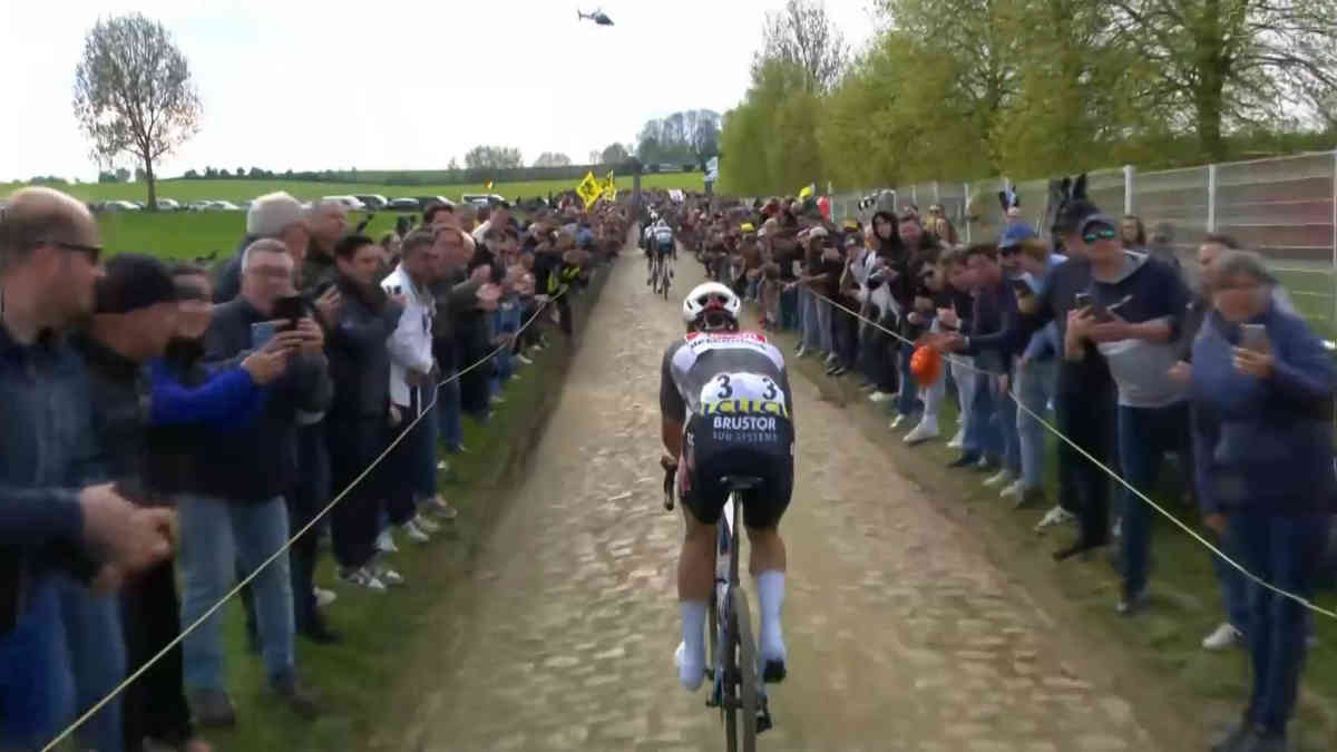 パリ~ルーベ最高難易度の星5つの石畳区間のうち、アランベールからの2つ目となるモン・サン・ペヴェル。ポガチャルが圧倒的不利な状況だが、マチューが途中で少し強めにペダルを踏み込むと、なんとフィリプセンが遅れてしまう!