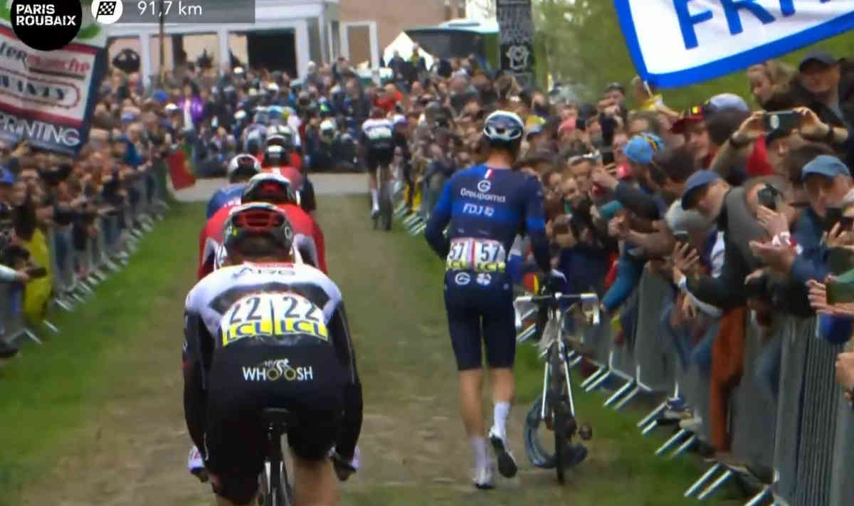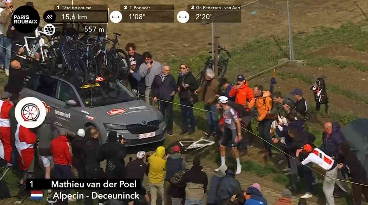 ポガチャルとの差をどんどん拡大していた圧倒的な強さのマチューだが、残り15kmの石畳区間でパンク。だがそんなトラブルも問題とならないタイム差があったためほぼノーダメ。