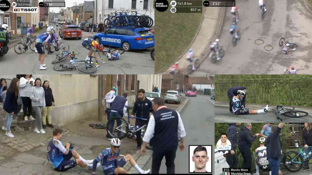 一方でプロトンは最初の石畳が始まる前の市街地エリアから突然落車が続発し始める。その中で、モビスターのマンリオ・モーロ、マティアス・ノルスゴー、アルベルト・トーレスの3人がリタイア。モビスターはすでに瀕死の状態・・・