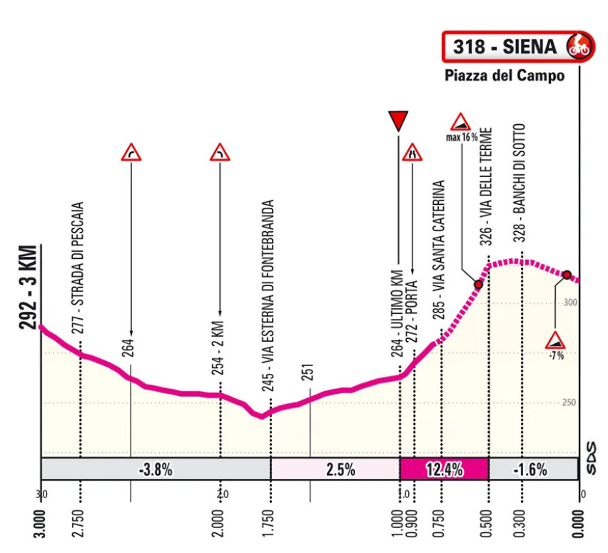 ゴールの舞台はこの画像の通りストラーデ・ビアンケと同じ。つまりカンポ広場とそれに至るあの市街地の激坂サンタ・カテリナだ。ラストも忠実にストラーデ・ビアンケを再現したステージとなっている。