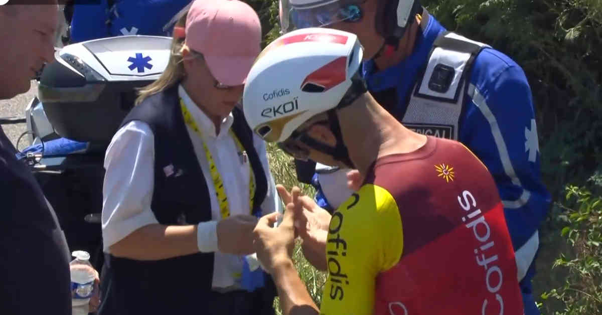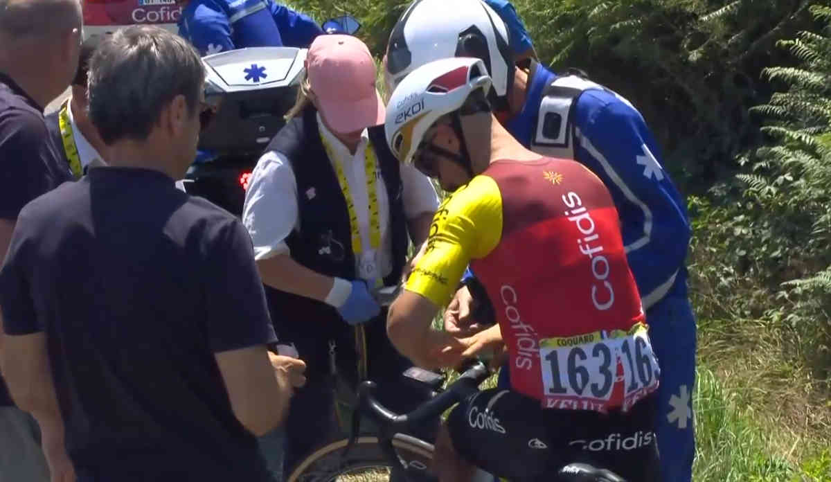 残り95km地点でCofidisのエーススプリンターであるブライアン・コカールが道端で謎の停車。右指をしきに気にし、それを医療フタッフに見せている映像が映る。