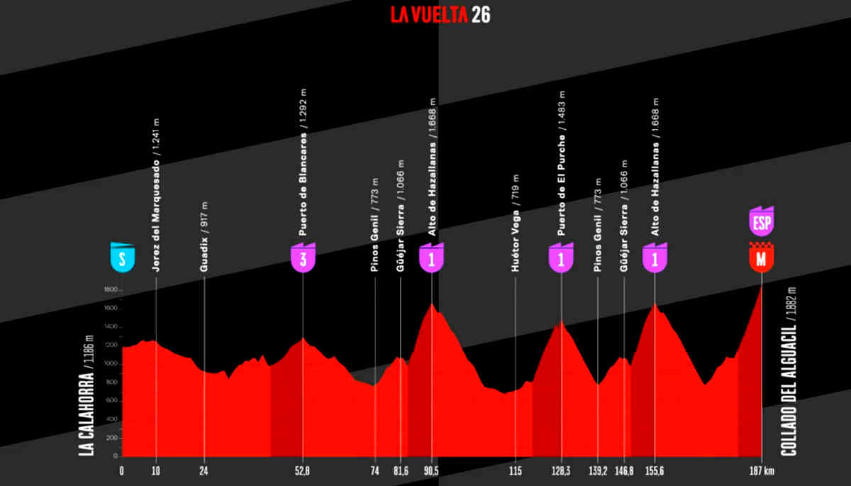 第4ステージは距離がたったの104.9kmしかないがこんなギザギザっぷり。特にスタート直後からいきなり標高2400mまで登るという頭のおかしい設定になっている。さすがブエルタだぜ!