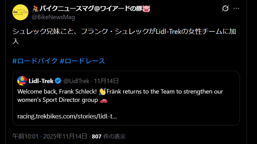 そのうち兄のフランクについては11月に次のX投稿で、Lidl-Trekの女子チームの監督に就任することを伝えた。