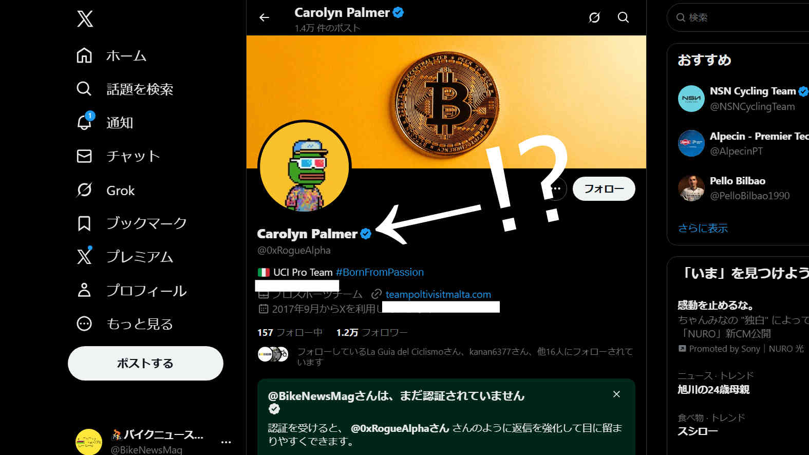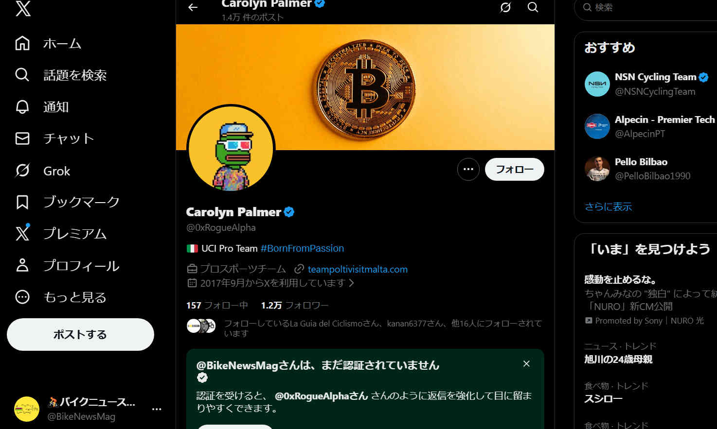 Xのプロフィールのヘッダー画像も、ロードレースとは全く無関係のビットコインのものとなっており、おそらくチームのXアカウントがハッキングされたのではないだろうか。
