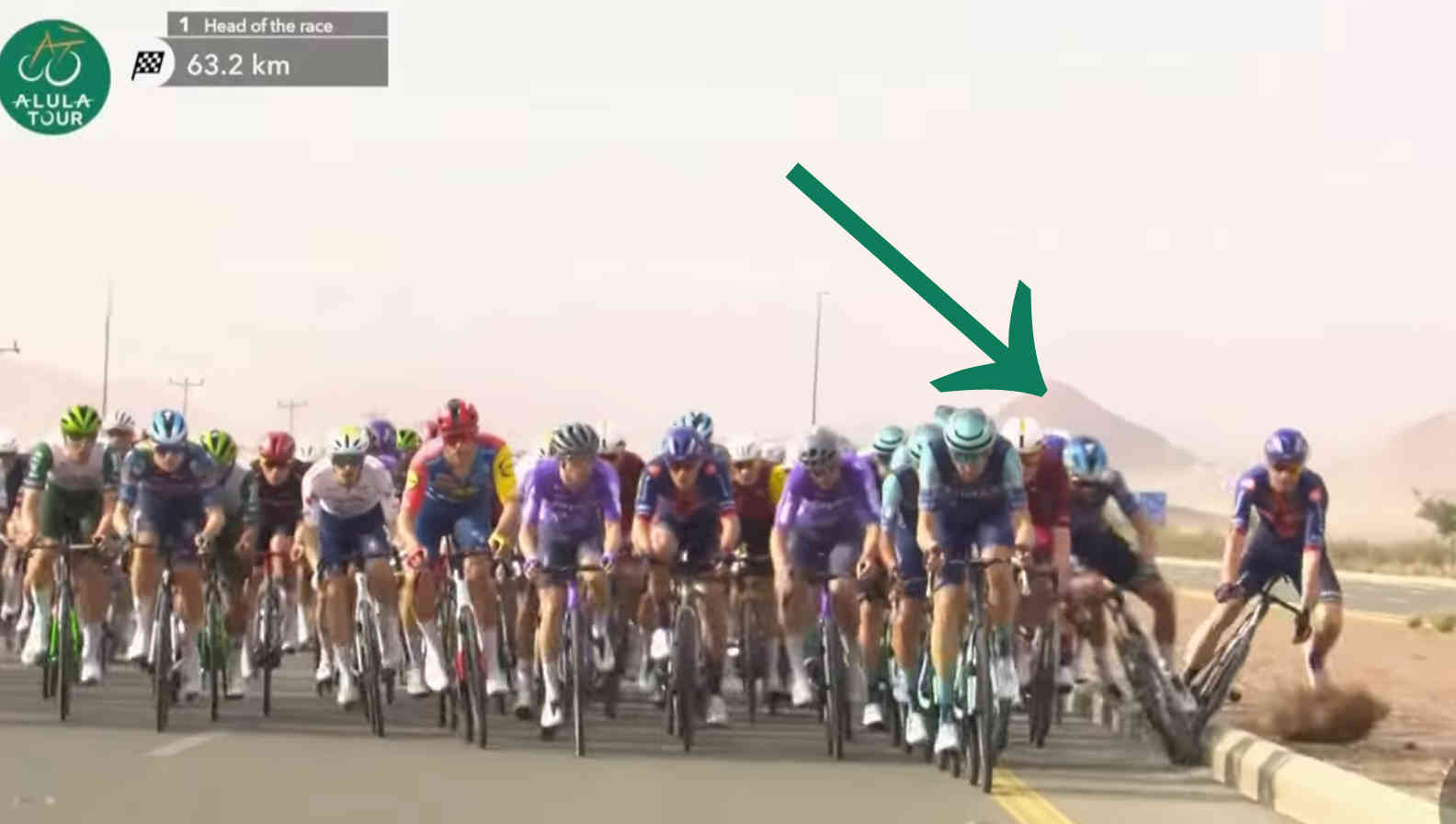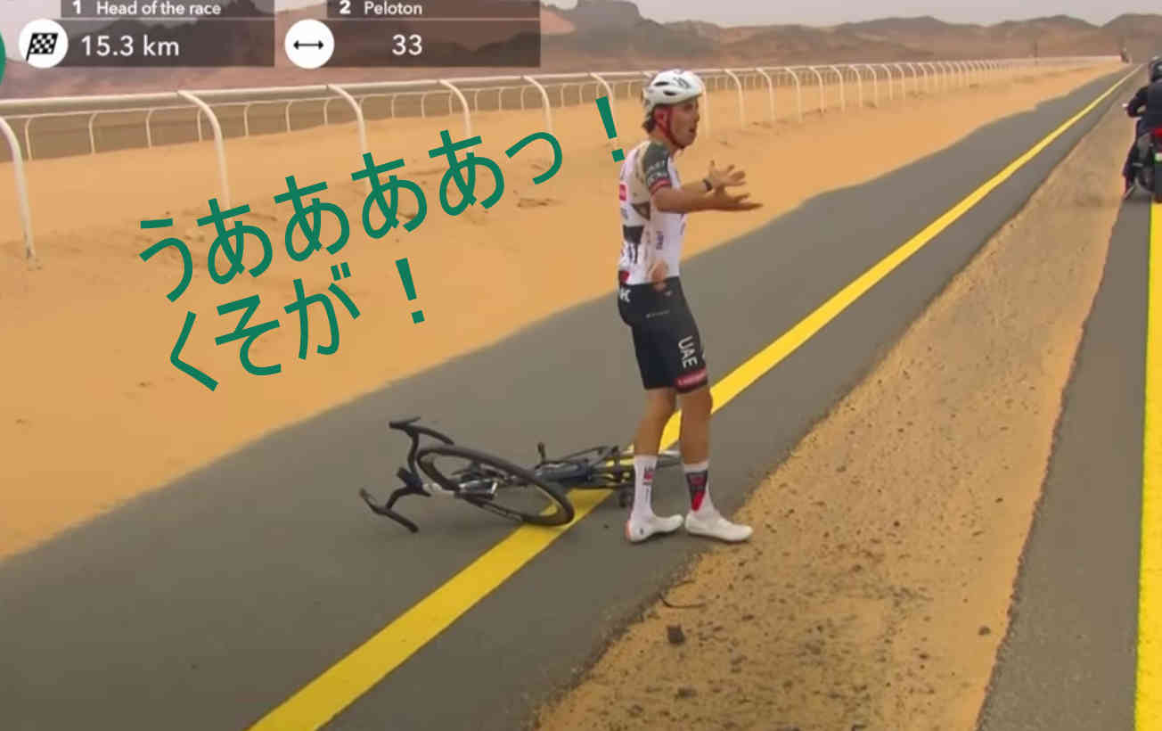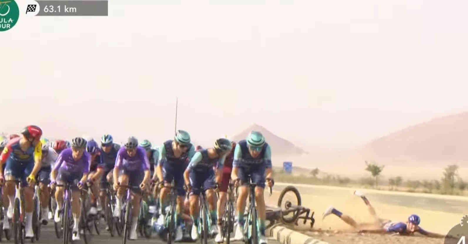 中東のレースは道幅も広く走りやすそうだが、路面に砂が浮いてスリップしやすかったり、なんといっても砂漠で踊る強風が曲者。そしてシーズンインしたばかりで久しぶりのレースでの集団走行ということでやはり落車が複数回発生した。