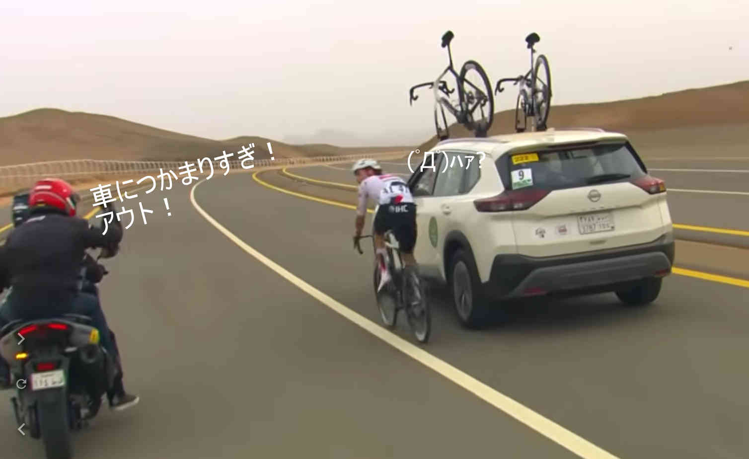 今度はその落車から隊列に戻るためにチームカーを利用して走っていたところ、チームカーにつかまりすぎていたために審判から注意を受けてしまう。