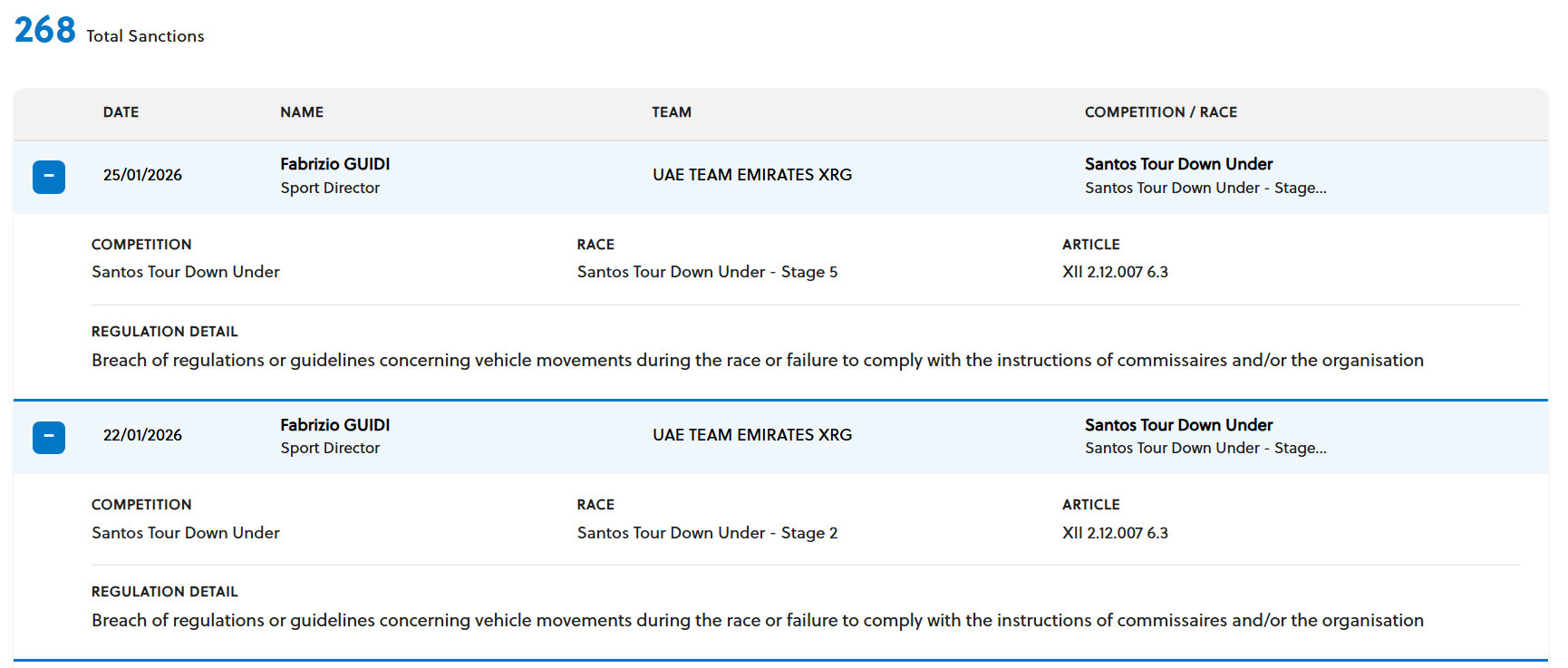 同監督が最初にイエローカードを受けたのは1月22日の第2ステージ。理由はレース中のチームカーの危険な運転だった。続いて2回目のイエローカードは1月25日の最終日の第5ステージ。理由はやはり同じく危険な運転行為だった。次の画像を見て欲しい。UCI公式のイエローカード交付リストだ。