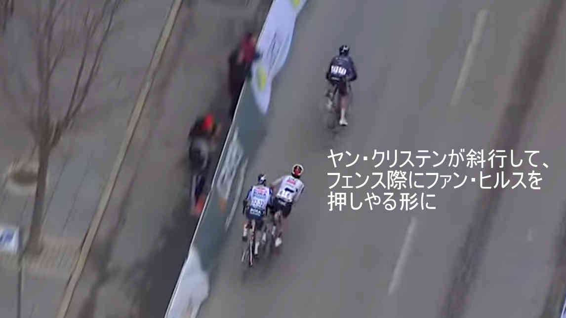 トム・ピドコックのスリップに入ろうとしたヤン・クリステンがフェンス際へ斜行し、その結果ファン・ヒルスがフェンスへ押し込まれる形なり、バランスを崩して落車。