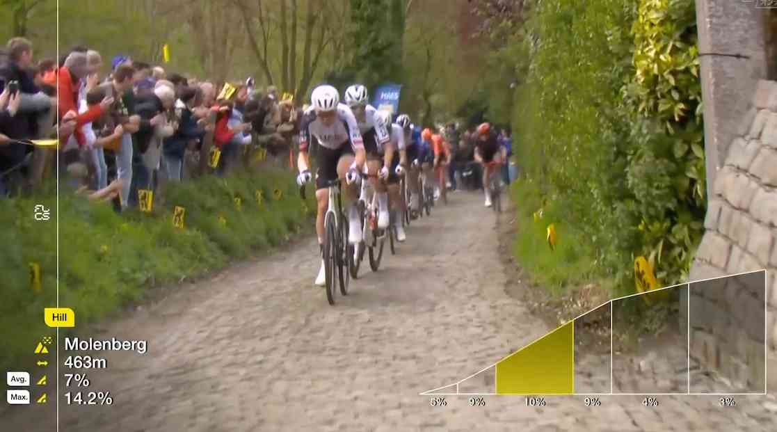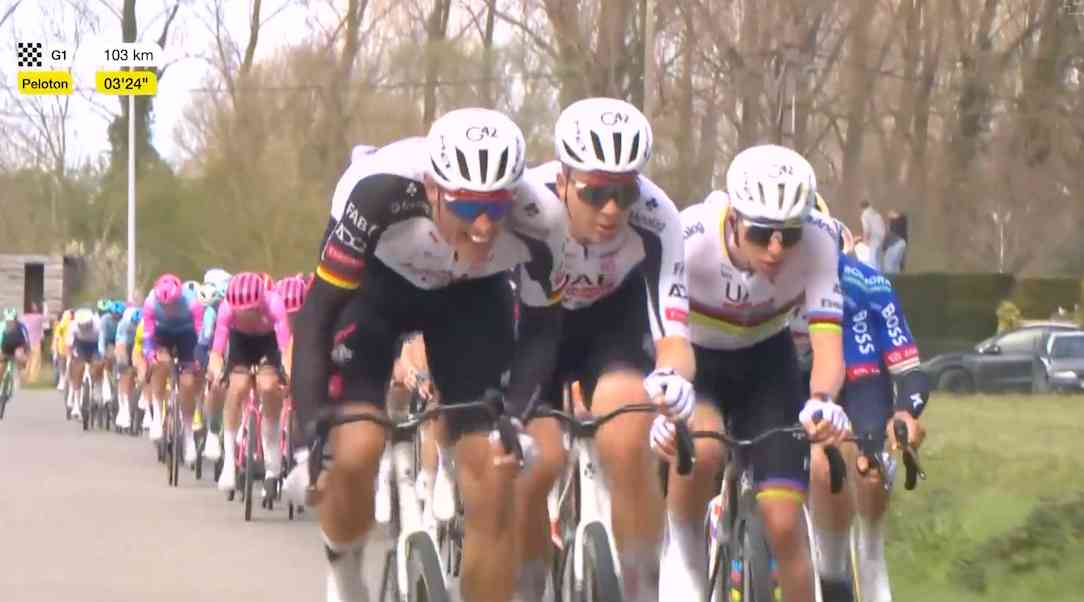 レーススタートから約170km走り、残り約100kmあたりで登場する石畳の登り区間モーレンベルグ(距離463m、平均斜度7%、最大斜度14.2%)。そこに入る前にUAEがしかけてきた。