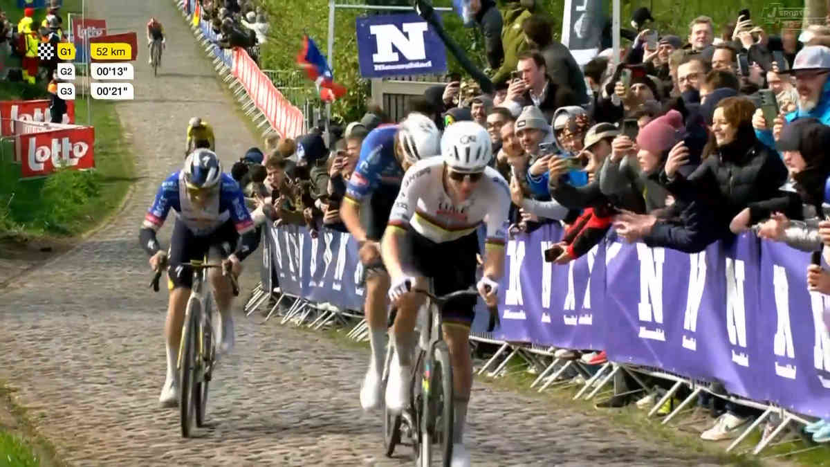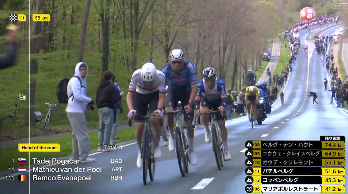 残り57km、オウデクワレモント~パテルベルクでポガチャルが攻撃スタート。マチューが食らいつき、レムコが遅れる