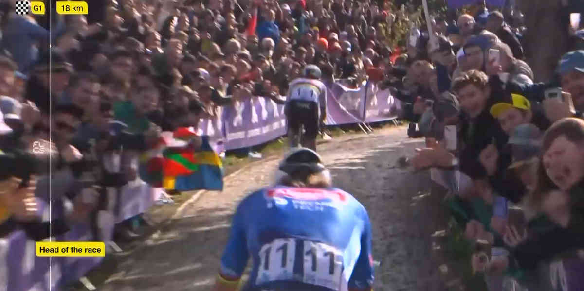 そして残り20kmを切って最終周回のオウデクワレモントが始まる。ポガチャルを先頭に、その背中にマチューという並びで突入するが、いきなりポガチャルが加速し勝負を決めにいく。